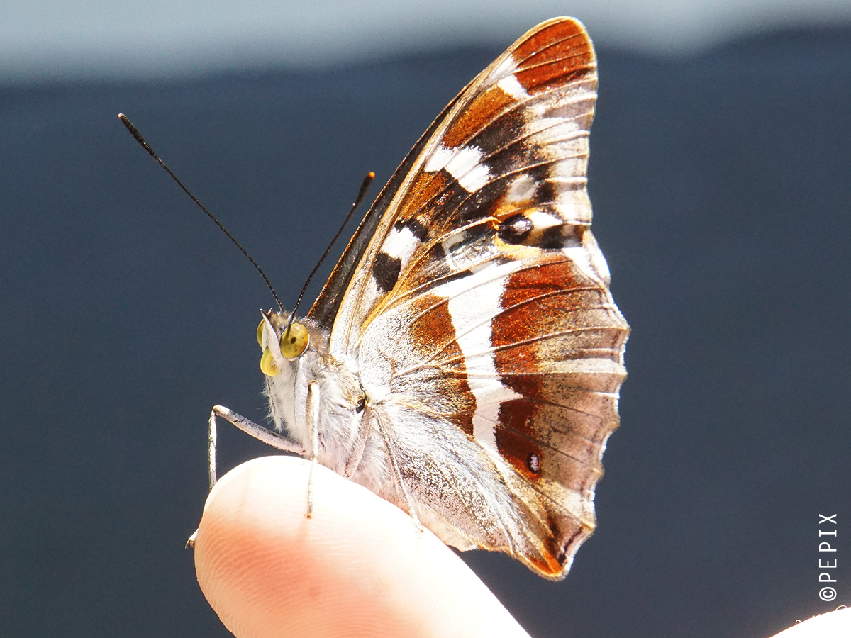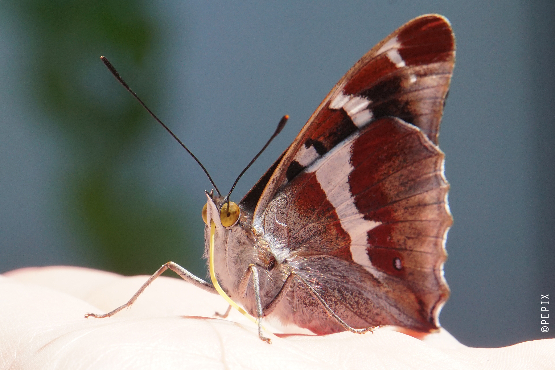 I came outside to photograph some lemon butterflies that had finally gathered on my lavender. A big butterfly fluttered past me in the most beautiful shades of blue. It sat down beside me on the chair and let me look at it. As if that wasn’t extraordinary enough, it fluttered onto my hand, so that I could photograph it! There it stayed for a few minutes! My son tried to lure it away with lavender, whereupon it settled on his arm. Crazy! Later I read that it was a so-called „Great Iris butterfly“, which can only be seen very rarely.