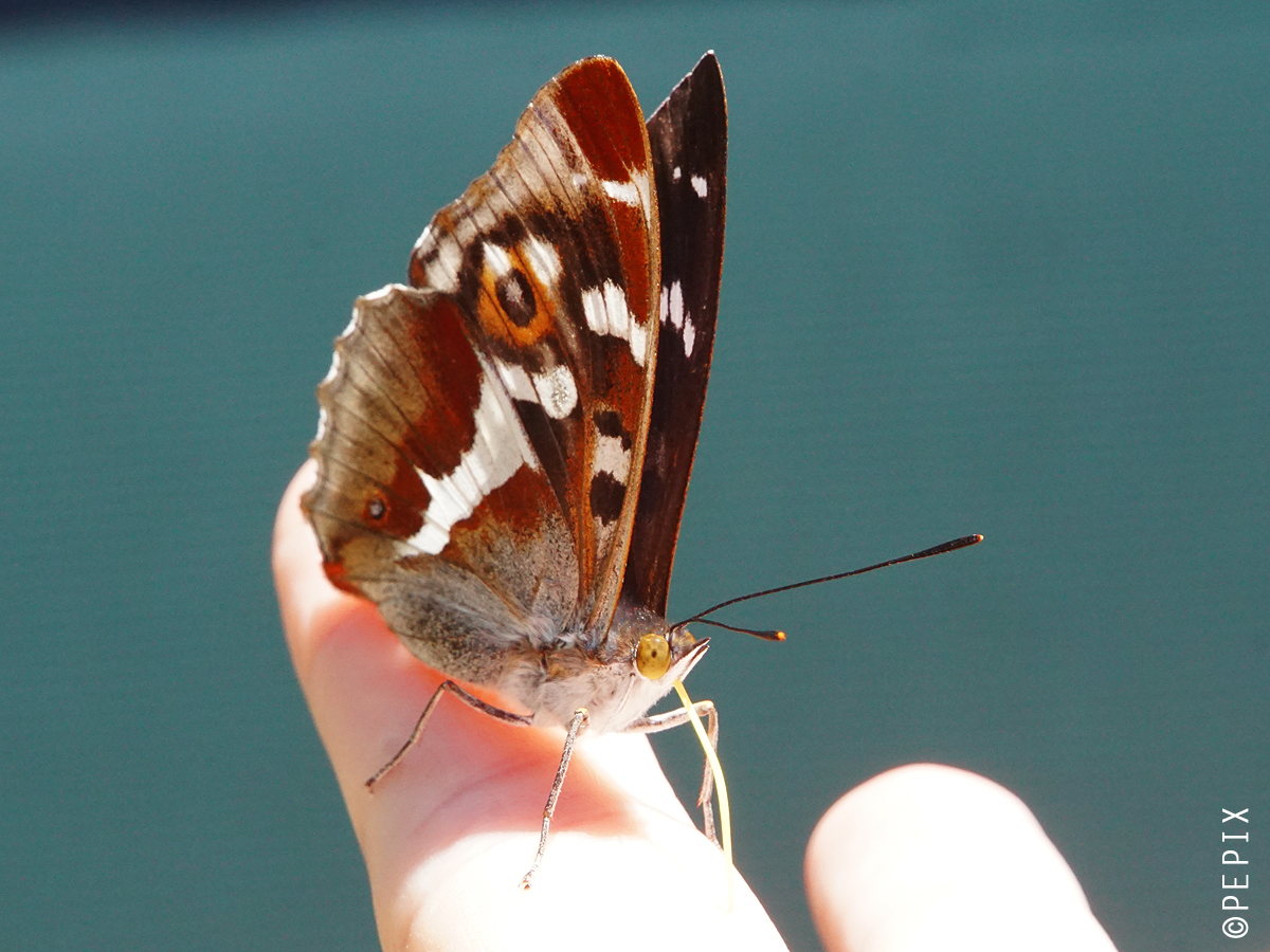 Ich kam nach draußen, um ein paar Zitronenfalter zu fotografieren, die sich endlich auf meinem Lavendel eingefunden hatten. Da flatterte ein großer Schmetterling in den schönsten Blautönen an mir vorbei. Er setze sich neben mich auf die Sonnenliege und ließ sich von mir bestaunen. Als wäre das noch nicht außergewöhnlich genug, flatterte er danach auf meine Hand und ließ sich dort in aller Seelenruhe fotografieren! Da blieb er dann für ein paar Minuten! Mein Sohn versuchte ihn mit Lavendel fortzulocken, worauf er sich bei ihm auf dem Arm niederließ. Irre! Ich hab später nachgelesen, dass es sich dabei um einen sogenannten „Großen Schillerfalter“ handelte, der nur recht selten zu sehen ist.