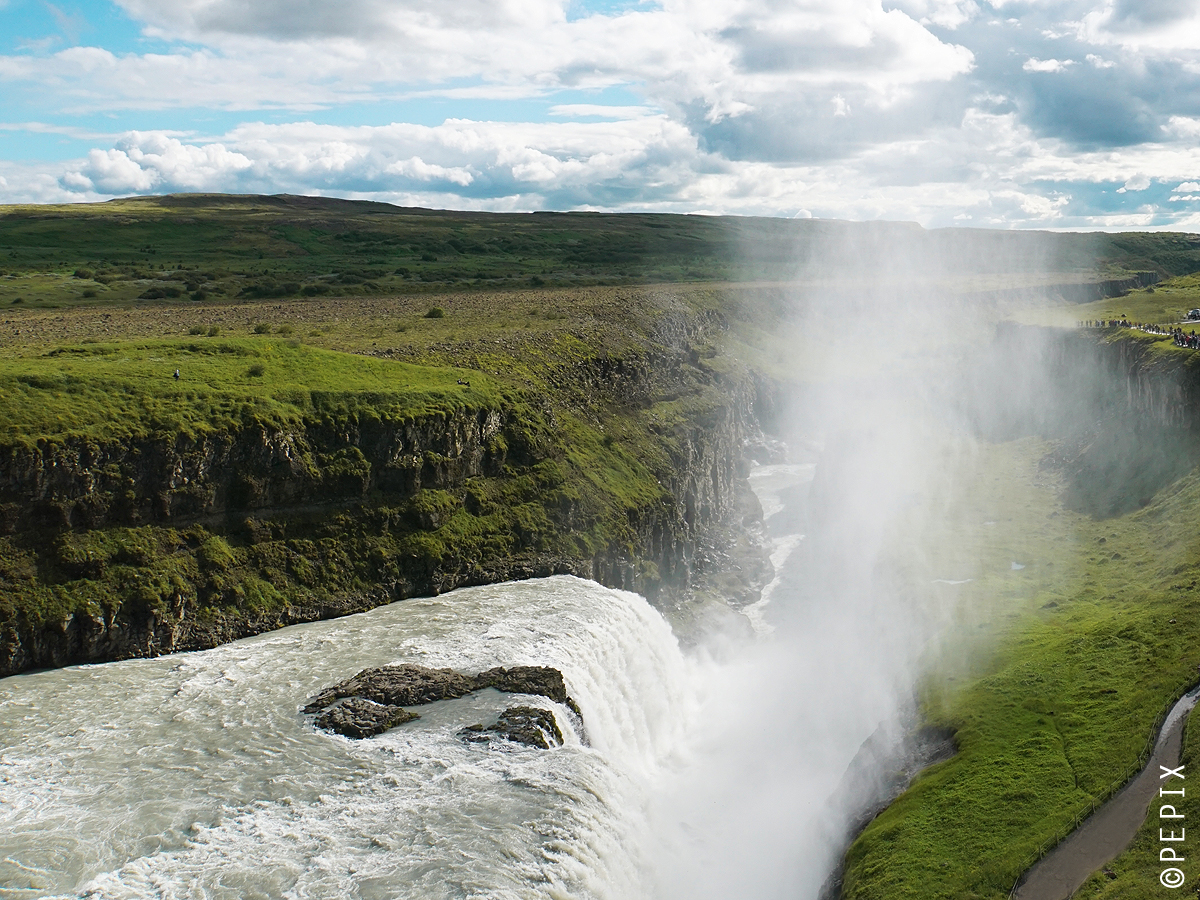 And then we went to Gullfoss, which is only a few kilometres away. A crazy waterfall consisting of two steps, the first of which is 11 m high and the second 21 m high. These two cascades are at right angles to each other. Here unbelievable masses of water rush past you and then plunge into a long gorge. You have the possibility to look at the whole thing from above or from the side… and if you’re lucky, you see a rainbow 🙂