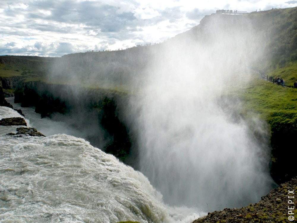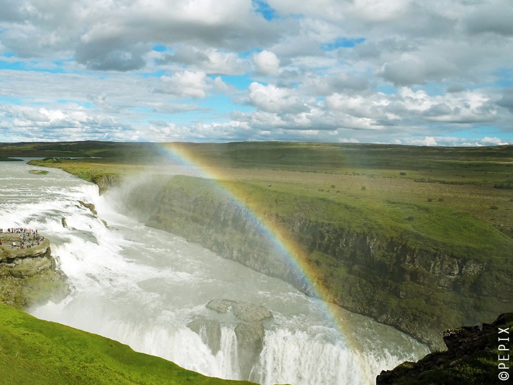 Und dann ging es zum Gullfoss, der nur wenige Kilometer entfernt liegt. Ein irrer Wasserfall, der aus zwei Stufen besteht, von denen die erste 11 m und die zweite 21 m Höhe besitzt. Diese beiden Kaskaden stehen etwa rechtwinklig zueinander. Hier rauschen unglaubliche Wassermassen an einem vorbei und stürzen dann in eine lange Schlucht. Man hat die Möglichkeit, sich das Ganze von oben anzusehen oder von der Seite … und wenn man Glück hat, sieht man einen Regenbogen 🙂