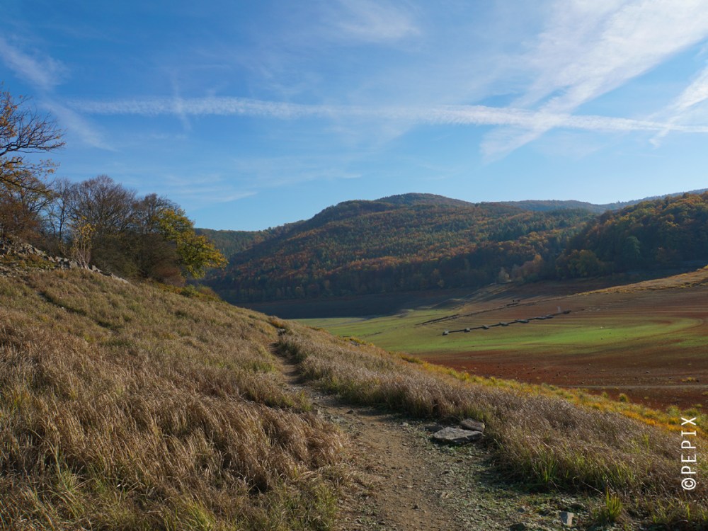 „Altantis of Edersee“ , this is how it is often described when the remains of the old walls of sunken villages reappear when the water is low. About 900 people in the area of the reservoir had to give up their homeland and settle elsewhere. Normally you can only see the old walls during a dive, but after this dry summer you can experience it completely by foot. Old streets and the foundation walls of whole villages, bridges and even the small model of the barrier wall can be seen and I walked with a strange feeling on old paths. On the one hand because I experienced a piece of history, on the other hand because this huge reservoir has only 10% of its usual water quantity and I cycled for miles around the lake without seeing water. Only on the very last kilometres, shortly before the barrier wall, I found a last little lake.