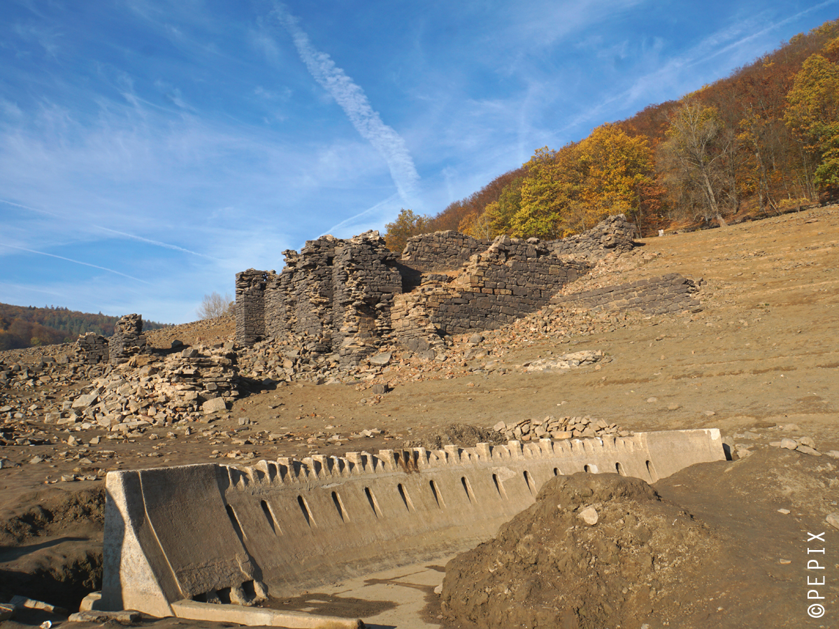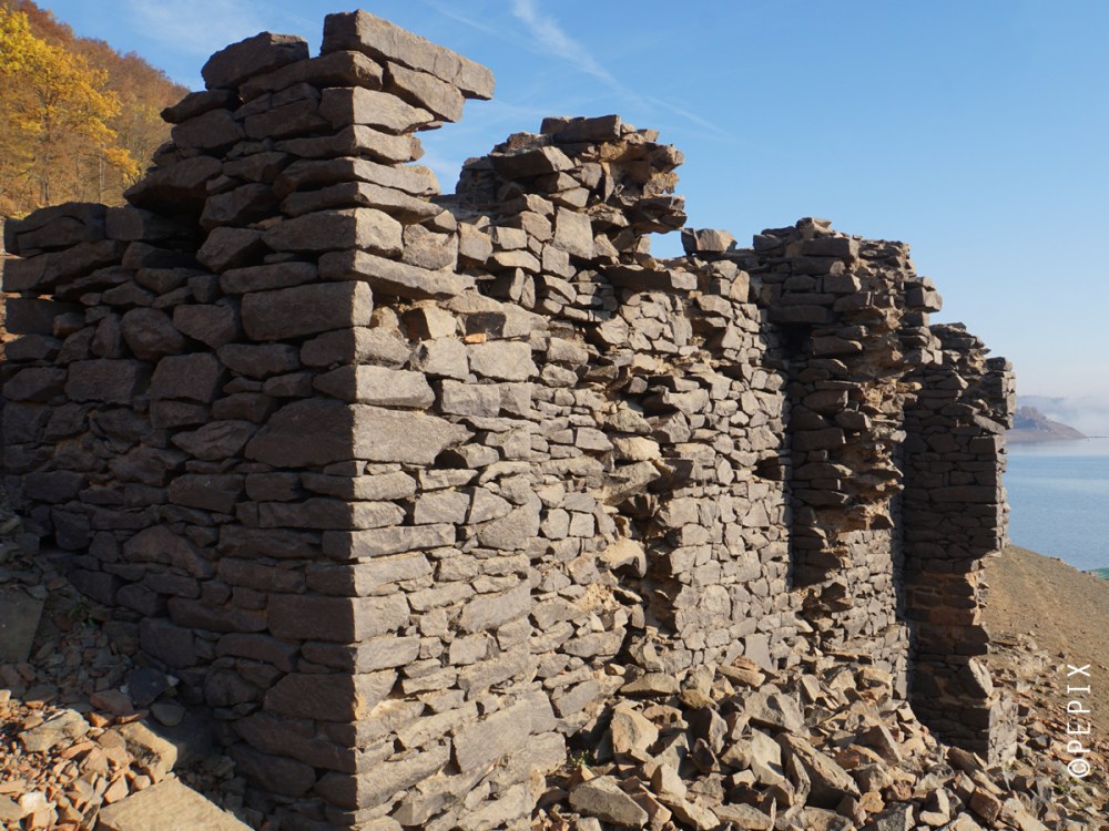 „Altantis des Edersees” , so wird es gern beschrieben, wenn bei Wassertiefstand die alten Mauerreste versunkener Dörfer wieder zum Vorschein kommen. Etwa 900 Menschen im Bereich des Stausees mussten damals ihre Heimat aufgeben und sich an anderer Stelle niederlassen. Normalerweise kann man sich die alten Grundmauern nur im Tauchgang ansehen, doch nach diesem trockenen Sommer kann man das komplett zu Fuß erleben. Alte Straßen und die Grundmauern ganzer Dörfer, Brücken und sogar das damalige kleine Modell der Sperrmauer kann man sehen und man wandelt mit einem komischen Gefühl auf alten Wegen. Einerseits weil man hier ein Stück Geschichte erlebt, andererseits weil dieser riesige Stausee nur 10% seiner sonstigen Wassermenge hat und man kilometerweit um den See radelt ohne Wasser zu sehen. Erst auf den allerletzten Kilometern, kurz vor der Sperrmauer, findet man ein letztes bisschen See.