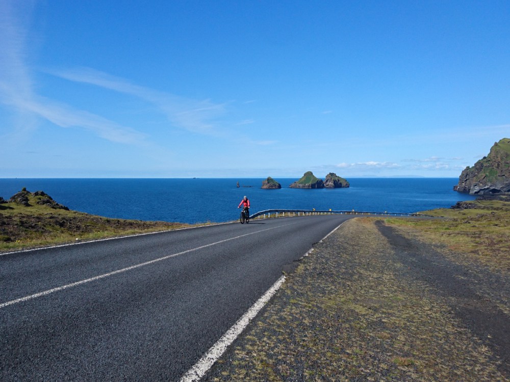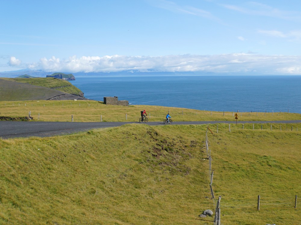 Und das hat sich wirklich gelohnt. Während es auf der Fähre noch nebelig und kalt war, schien eine Stunde später die Sonne. Wir liehen uns Räder aus und radelten ans andere Ende der Insel, wo es einen wirklich spektakulären Küstenpfad gibt, wo man prima Papageientaucher beobachten kann. Da haben wir viel Zeit verbracht und den putzigen Vögelchen zugeschaut. Überhaupt war Heimaey wunderschön! Wir kletterten noch auf einen Felsen in der Nähe vom Hafen, von dem man einen spektakulären Blick hatte.
