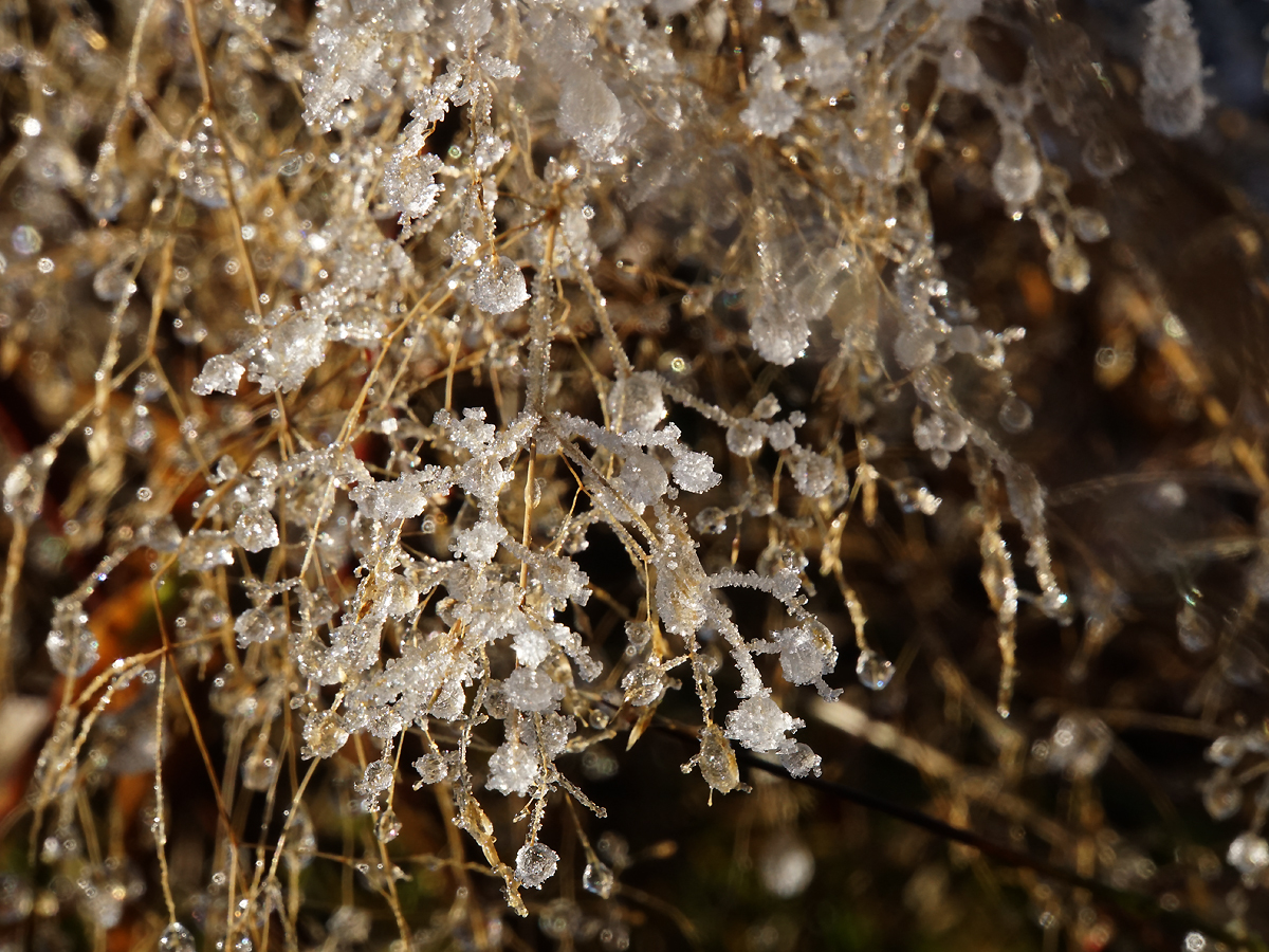 … And just a few steps further, where the sun sent its rays, the beautiful ice wonders melted into beautiful little dew wonders. Some are still half frozen, as if they didn’t really know whether they want to be water or ice.