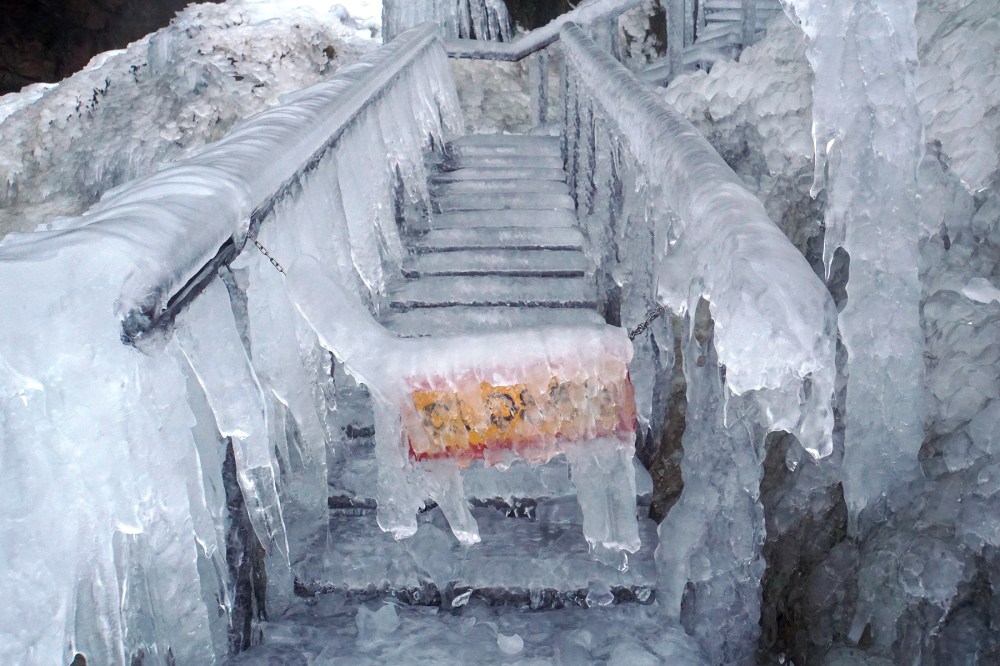 I had wished for frozen waterfalls as well, besides the northern lights. As we drove further south, it became milder and started to rain. But you could still see that it had been bitterly cold the week before. The Seljalandsfoss, one of my favourite waterfalls, had transformed everything around it into a rigid ice world … like in a fairy tale. You couldn’t walk behind it and even the „Closed“ sign was completely frozen. Even the way up to the sign was not possible to go without spikes. A few tried it and slid helplessly back and forth.
