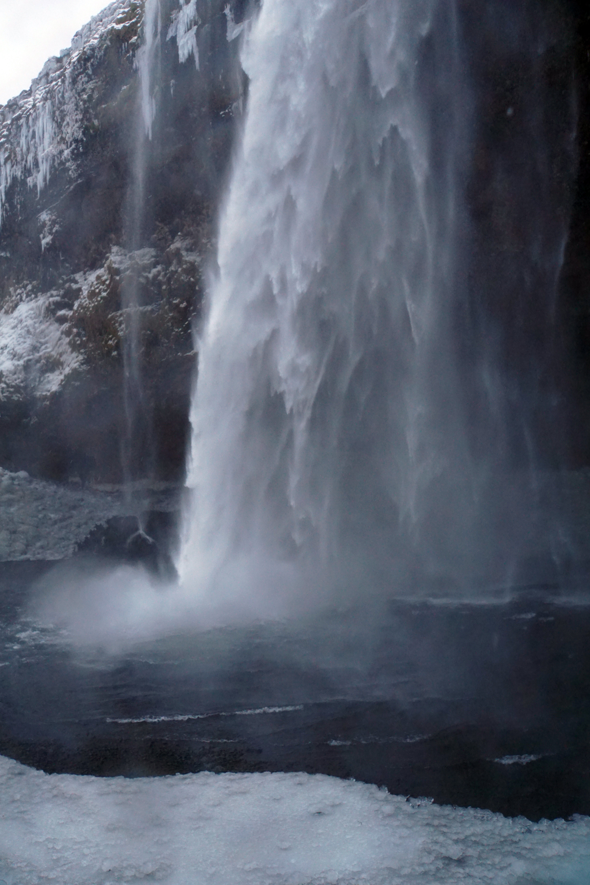 Ich hatte mir, neben den Polarlichtern, ebenfalls gefrorene Wasserfälle gewünscht. Als wir weiter Richtung Süden fuhren, wurde es milder und fing an zu regnen. Aber man konnte noch genau sehen, dass es die Woche davor bitterkalt gewesen war. Der Seljalandsfoss, einer meiner Lieblingswasserfälle, hatte mit seiner Gischt alles rundherum in eine starre Eiswelt verwandelt … wie in einem Märchen. Man konnte auch nicht hinter ihm herlaufen und selbst das „Closed“-Schild war komplett vereist. Schon der Weg bis zu dem Schild war ohne Spikes nicht zu schaffen. Ein paar versuchten es und rutschten hilflos hin und her.