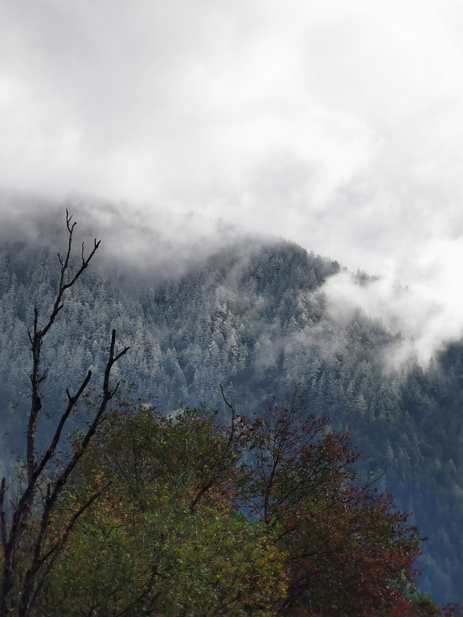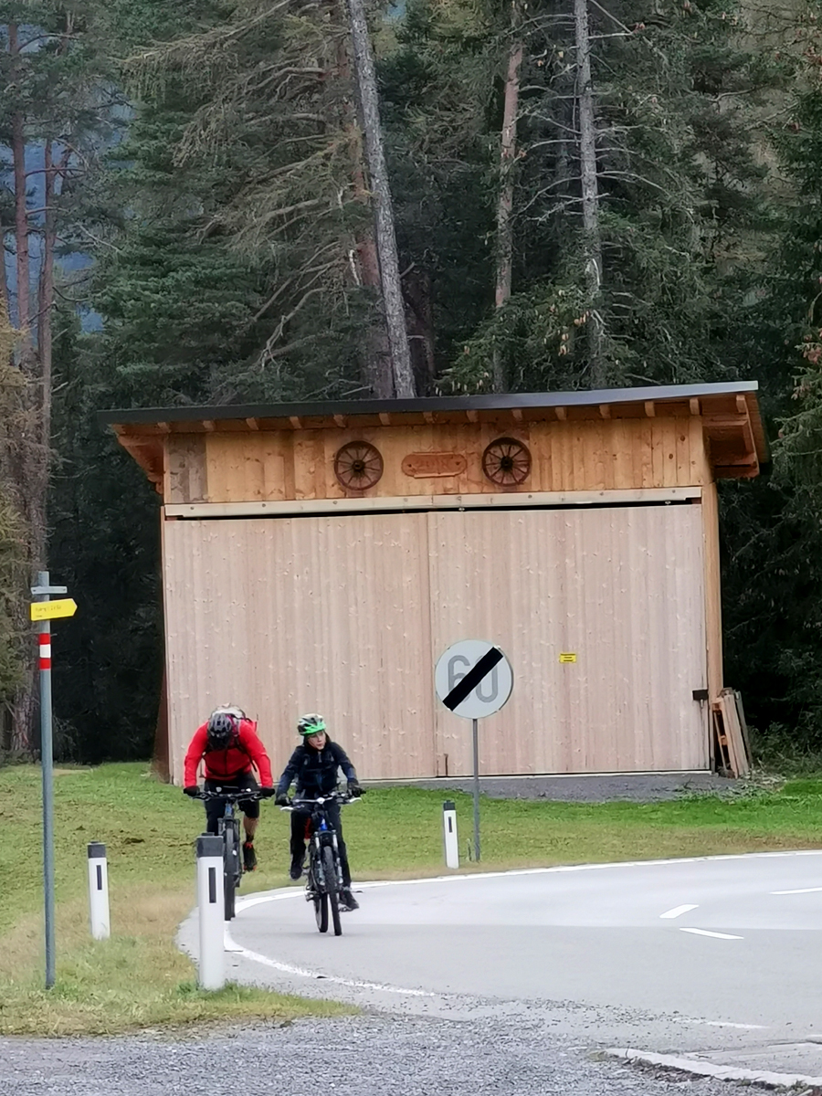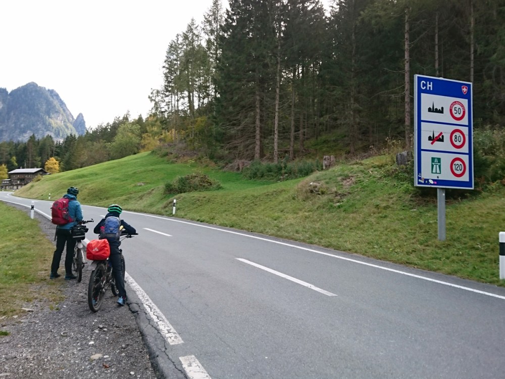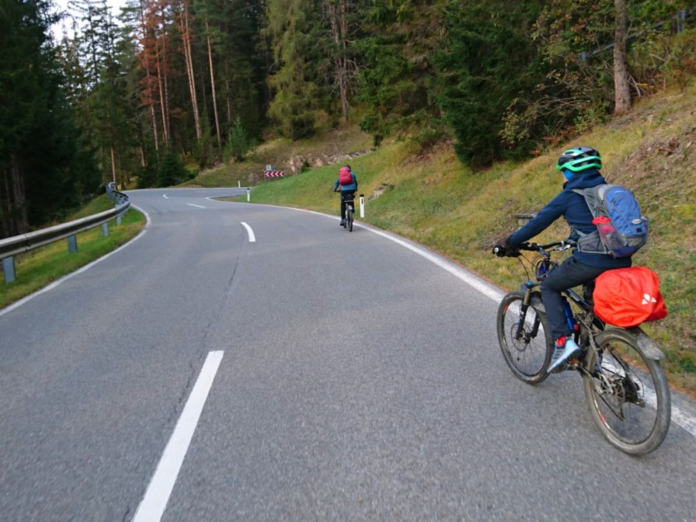 Danach waren wir für ein paar Kilometer in der Schweiz. Nachdem wir uns aus der Schlucht emporgekämpft hatten, konnten wir eine Serpentinenstraße nach Martina hinunterfahren und dann lag die gefürchtete 12-Kehren-Straße vor uns. 400 Höhenmeter auf 4 Kilometern! Tatsächlich ließ sie sich aber besser erklimmen als befürchtet und so erreichten wir abends bei ein paar Schneeflöcken in der Luft Nauders, wo wir hundemüde ins Bett fielen.