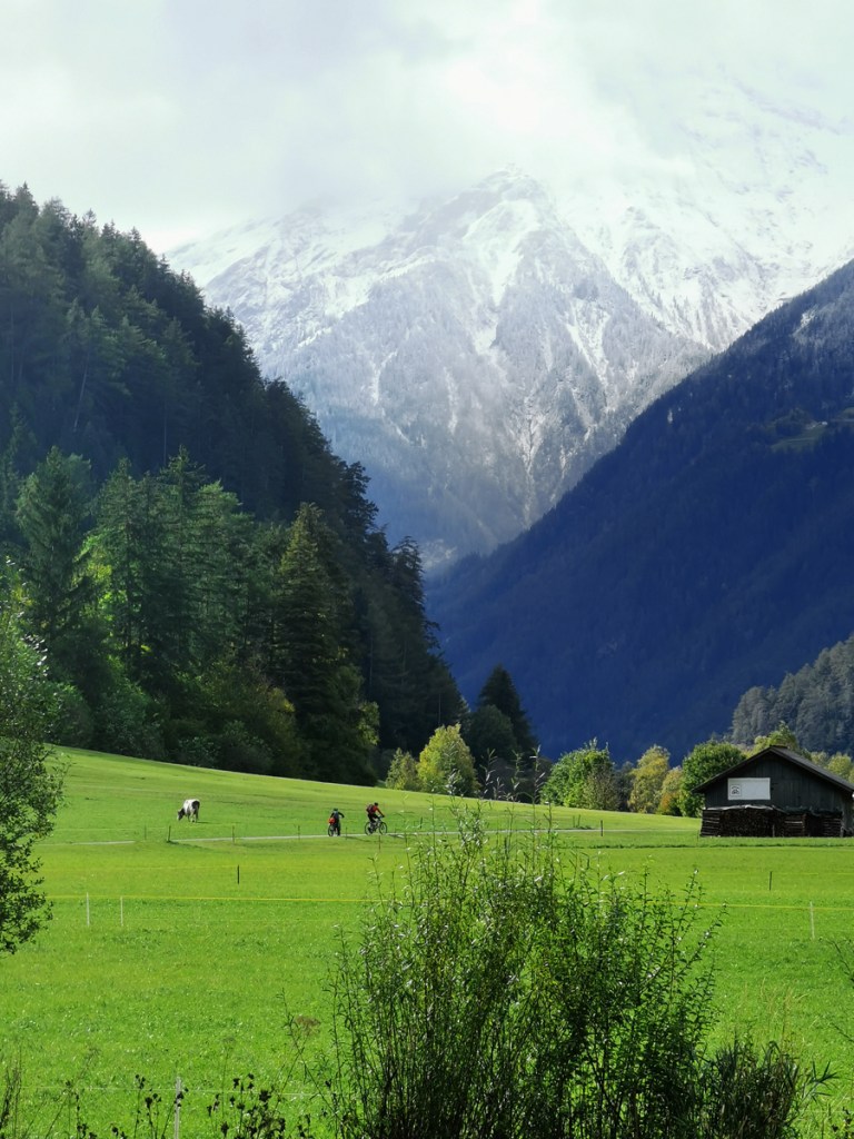 Die Gegend, durch die wir radelten, war atemberaubend schön. Wir radelten lange am unfassbar türkisen Inn entlang. Was für eine Farbe! Immer wieder führten uns Brücken über den schönen Fluss und um uns herum ragten schneebedeckte Berge auf. An diesem Tag sind wir keiner Menschenseele begegnet und konnten die Natur Tirols aus vollen Zügen genießen.