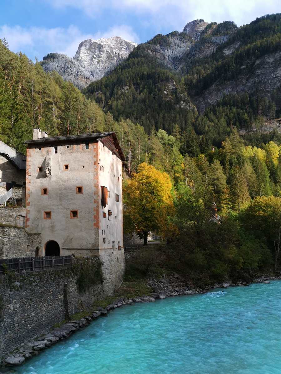 Kurz hinter Pfunds, einem schmucken kleinen Städtchen, wurde das Inn-Tal immer schmaler und wir kamen nach Altfinstermünz. Das ist eine mittelalterliche Gerichtsstätte und Grenzbefestigung auf der Via Claudia Augusta in der gleichnamigen Finstermünzschlucht. Die Feste liegt auf dem am Fuß des Finstermünzpasses, wo die bis 1854 benutzte alte Straße den Inn erreicht, der hier die Grenze zwischen Tirol (Österreich) und Graubünden (Schweiz) bildet. Hier war bereits vor dem 10. Jahrhundert ein Gerichtssitz. Eine wunderschönes Fleckcken voller Atmosphäre.