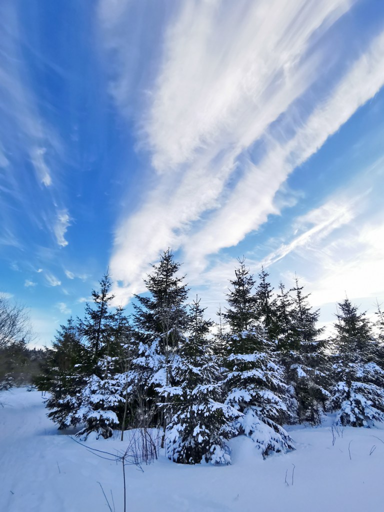 Auch das haben wir neben Wasserfall, Kahlen Asten und Mpemba-Effekt noch ins sonnig-frostige Wochenende gepackt: Eine Schneewanderung zum höchsten Berg in NRW. Zum Langenberg, der mit 843 m noch ein Meter höher ist als der Kahle Asten. Wir sind vom Clemensberg aus gestartet und durch knirschenden, glitzernden Schnee insgesamt 10 km gelaufen. Der Langenberg an sich ist unspektakulär, weil man von dort keine Aussicht hat, aber der Weg dahin war klasse! Und die Wolken, die den Wetterwechsel ankündigten, auch!