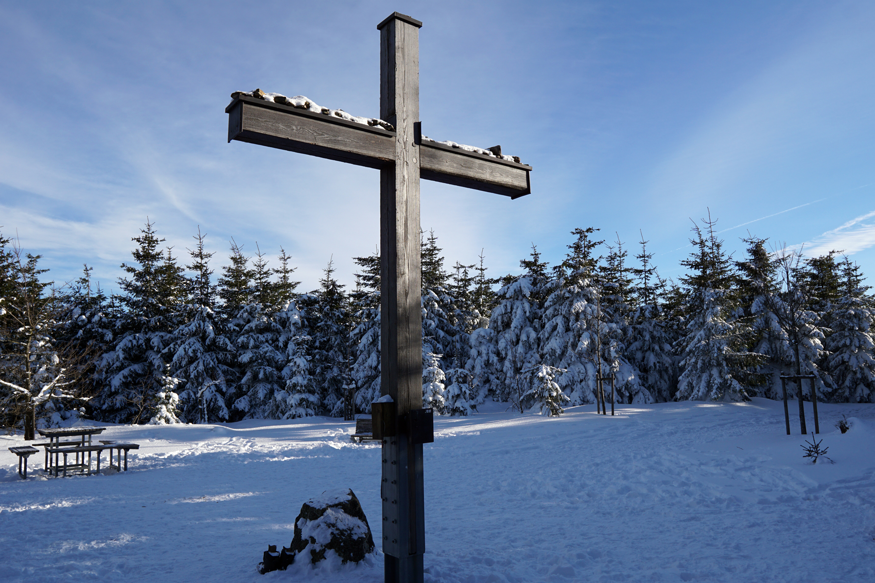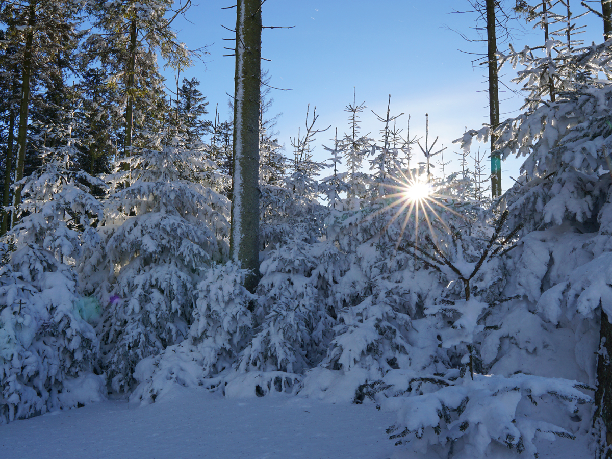 In addition to the waterfall, Kahler Asten and Mpemba effect, we also made this on the sunny, frosty weekend: a snow hike to the highest mountain in NRW. To the Langenberg, which with 843 m is still one meter higher than the Kahle Asten. We started from the Clemensberg and walked a total of 10 km through crunching, glistening snow. The Langenberg itself is unspectacular, because you have no view from there, but the way was great!