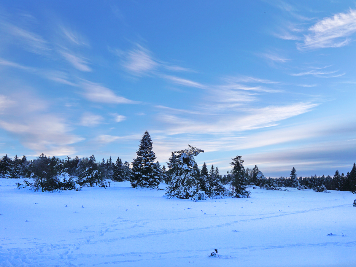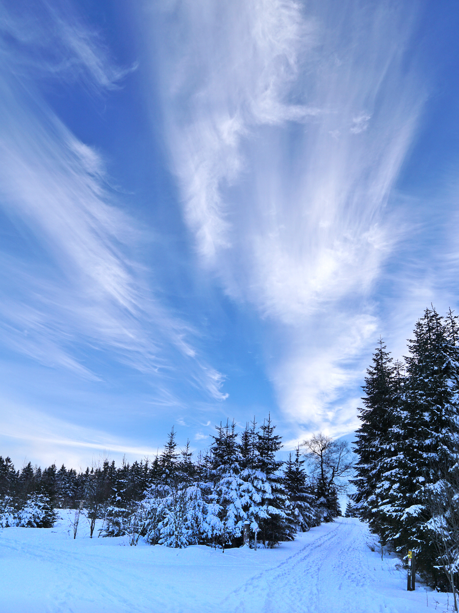 Auch das haben wir neben Wasserfall, Kahlen Asten und Mpemba-Effekt noch ins sonnig-frostige Wochenende gepackt: Eine Schneewanderung zum höchsten Berg in NRW. Zum Langenberg, der mit 843 m noch ein Meter höher ist als der Kahle Asten. Wir sind vom Clemensberg aus gestartet und durch knirschenden, glitzernden Schnee insgesamt 10 km gelaufen. Der Langenberg an sich ist unspektakulär, weil man von dort keine Aussicht hat, aber der Weg dahin war klasse! Und die Wolken, die den Wetterwechsel ankündigten, auch!