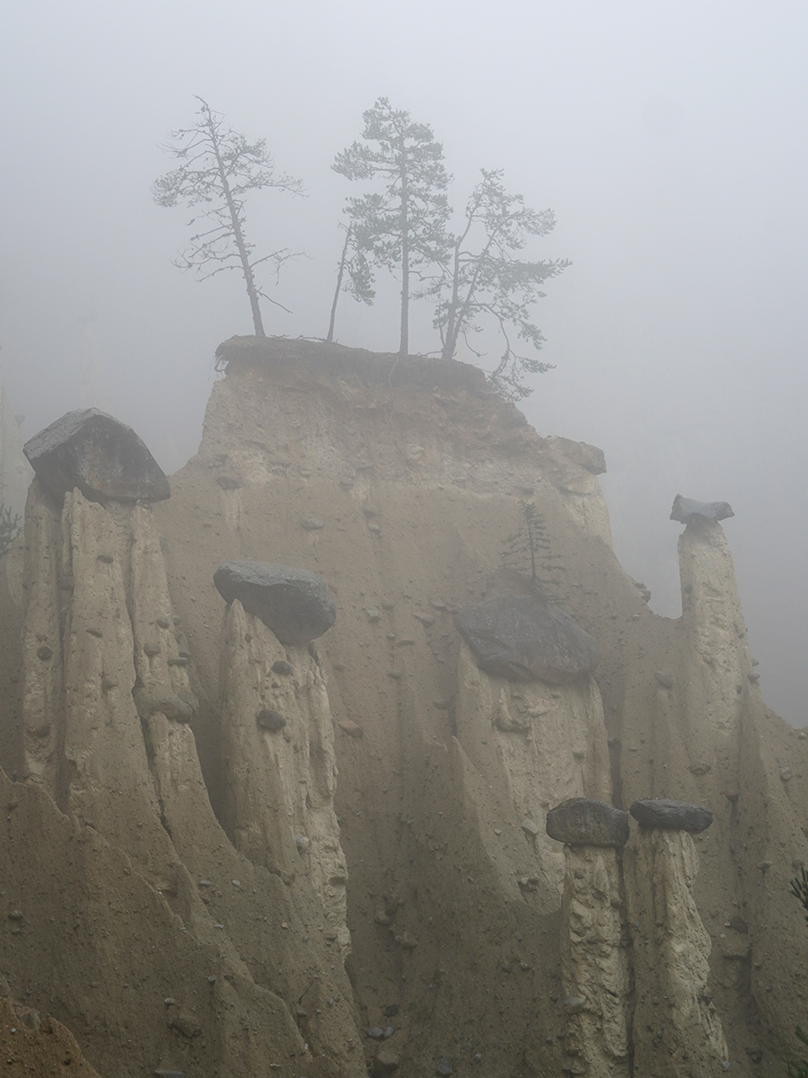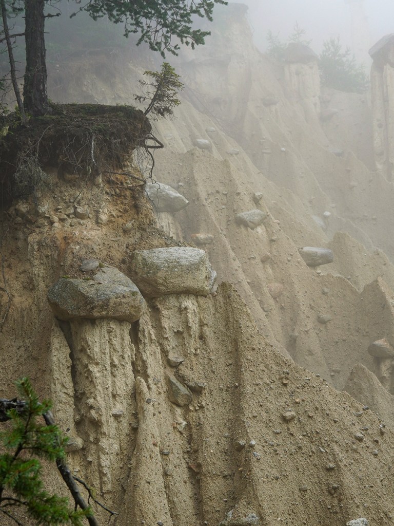Erdrutsche, Wasser, Schneeschmelze und Erosion – alles Zutaten, die – wenn man sie im Laufe der Jahrhunderte zusammenmischt – kunstvolle Erdpyramiden ergeben. Die lehmhaltigen Säulengebilde ragen mit einen Stein besetzt in die Höhe und hinterlassen bei ihren Besuchern eine bleibende Faszination. Man fühlt sich in einen Fantasy-Film versetzt. Passend dazu hatten wir (wie von mir gewünscht) nebeliges Wetter, was das Ganze noch mystischer machte.