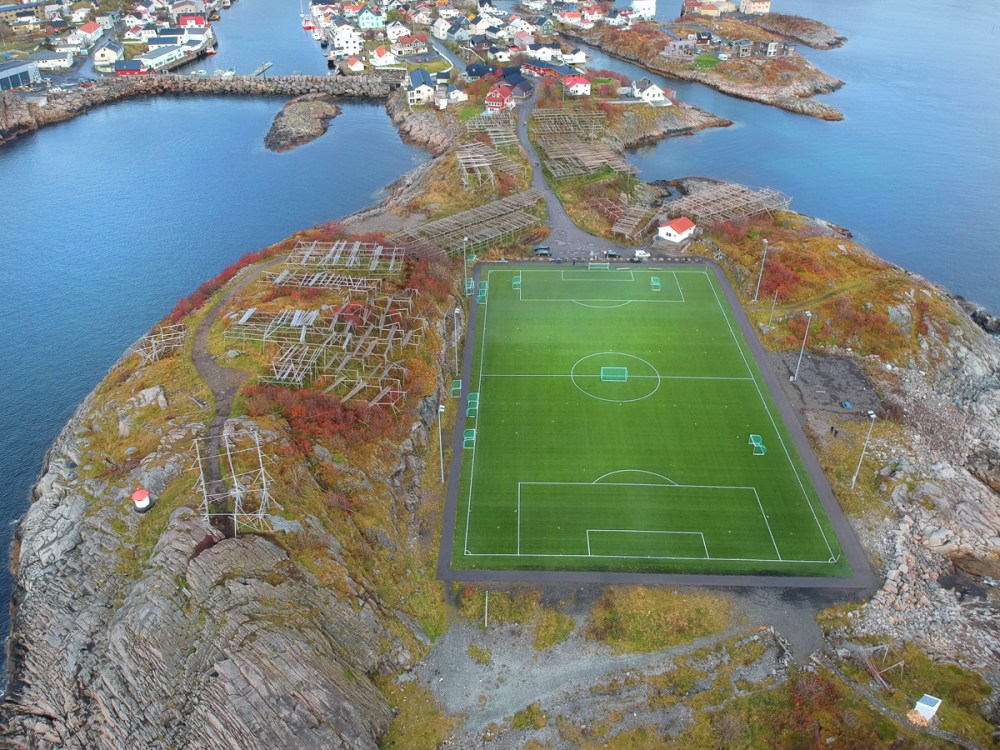 Ja, Henningsvær ist für sein Fußballfeld berühmt, welches auf einer kleinen Insel liegt und das perfekte Drohnenmotiv ist. Einmal hab ich sie fliegen lassen und nach der Landung ein paar Bilder auf mein Handy geladen (s.u.). Beim nächsten Flug war sie schon im Landeanflug und ist plötzlich völlig außer Kontrolle abgehauen. Das letzte, was ich auf dem Display sah, war Wasser. Trotz intelligenter Rückkehrautomatik ist sie nicht zurückgekommen. RIP, kleine Spark!