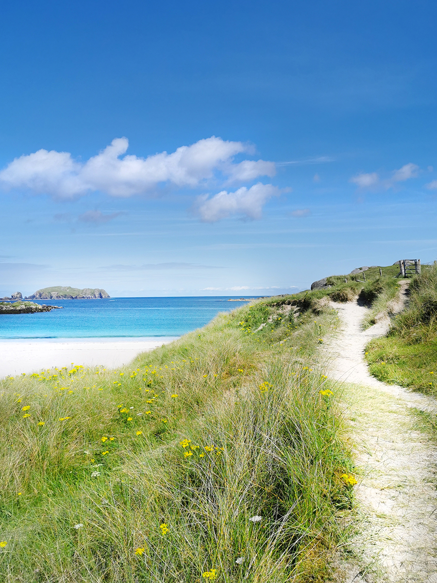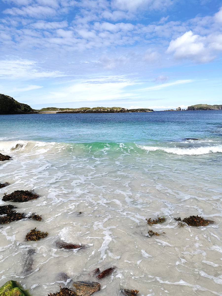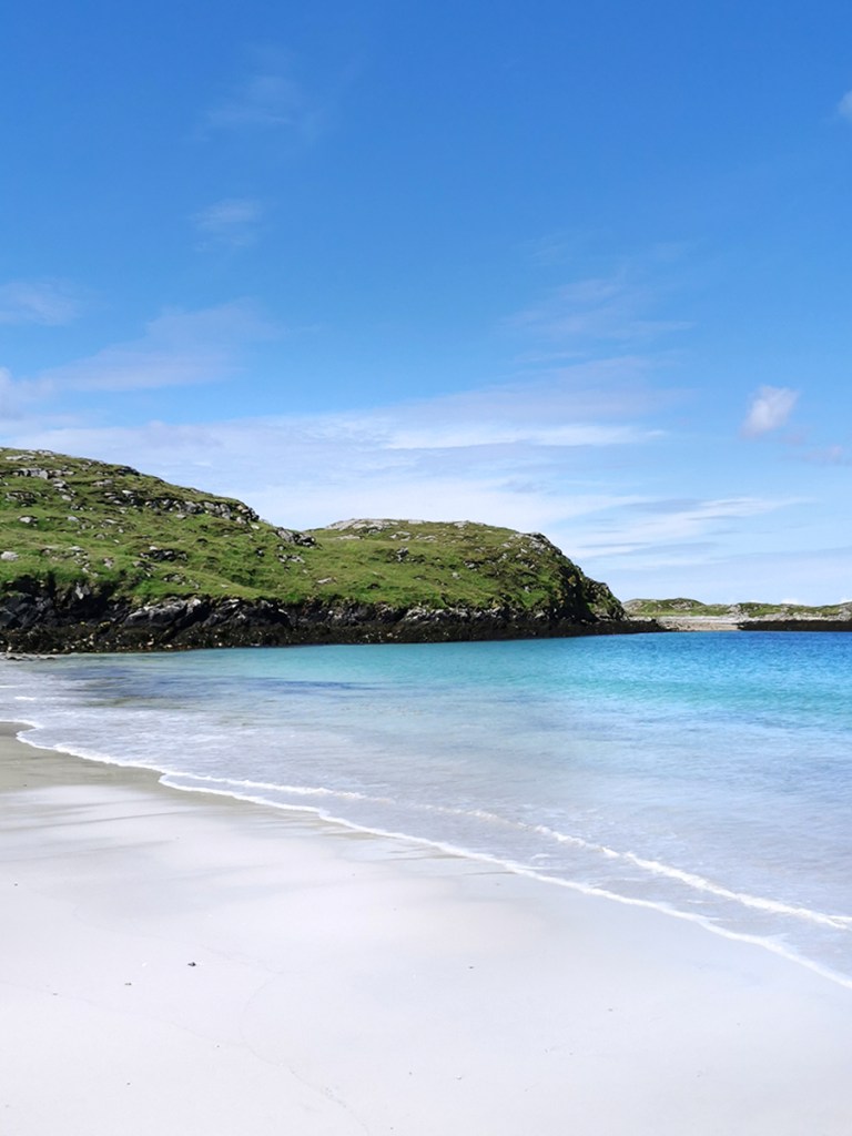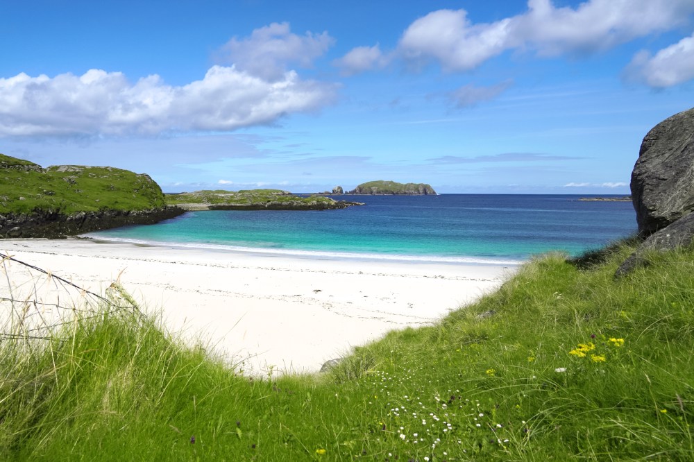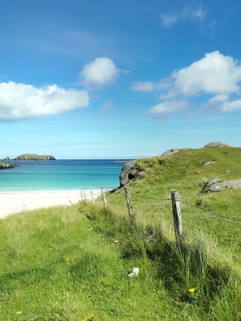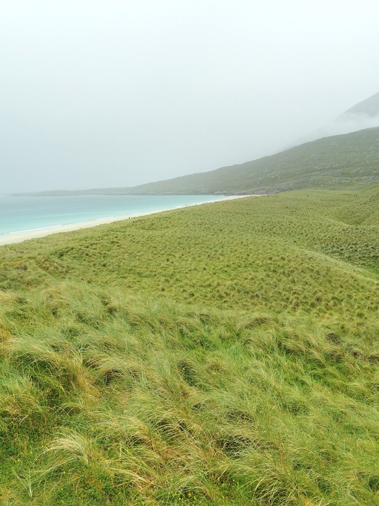 Am zweiten Tag war das Wetter leider nicht mehr so schön, da waren wir am bekannten Luskentyre Beach. Der Weg dahin ist auch herausfordernd, aber man wird mit azurblauem Wasser, weißem Sand und Ruhe entlohnt. Im Hinterland türmen sich Karstlandschaften auf. Aber leider regnete es die ganze Zeit und so haben wir nur einen Spaziergang an dem endlosen zauberhaften Strand gemacht.