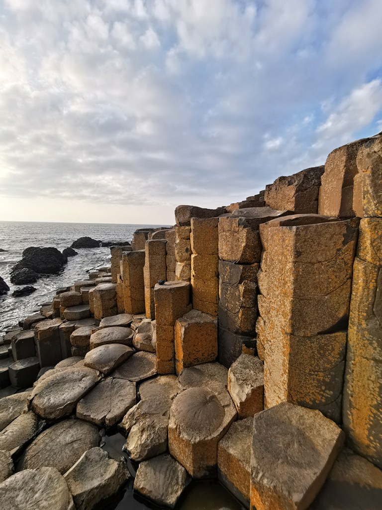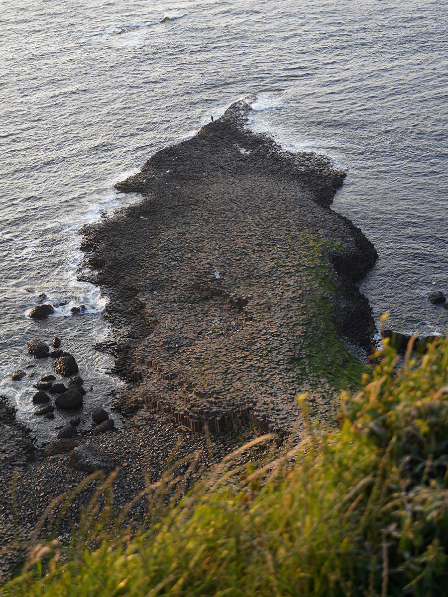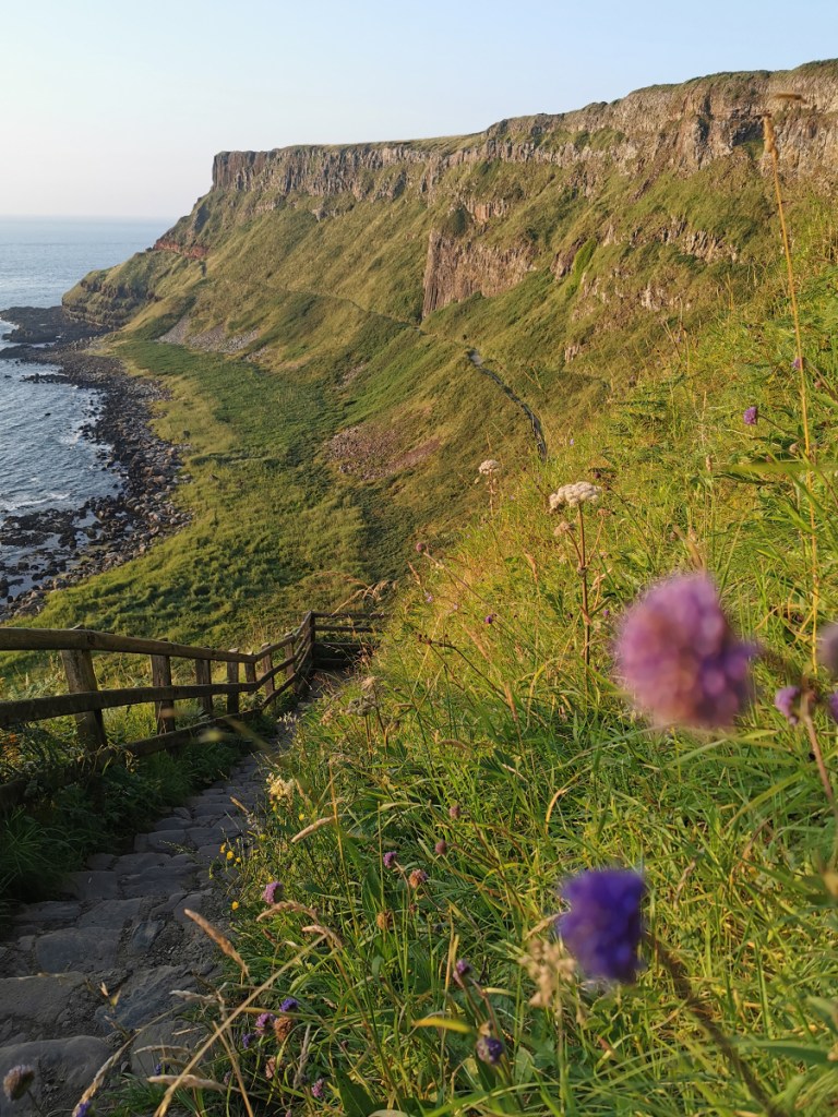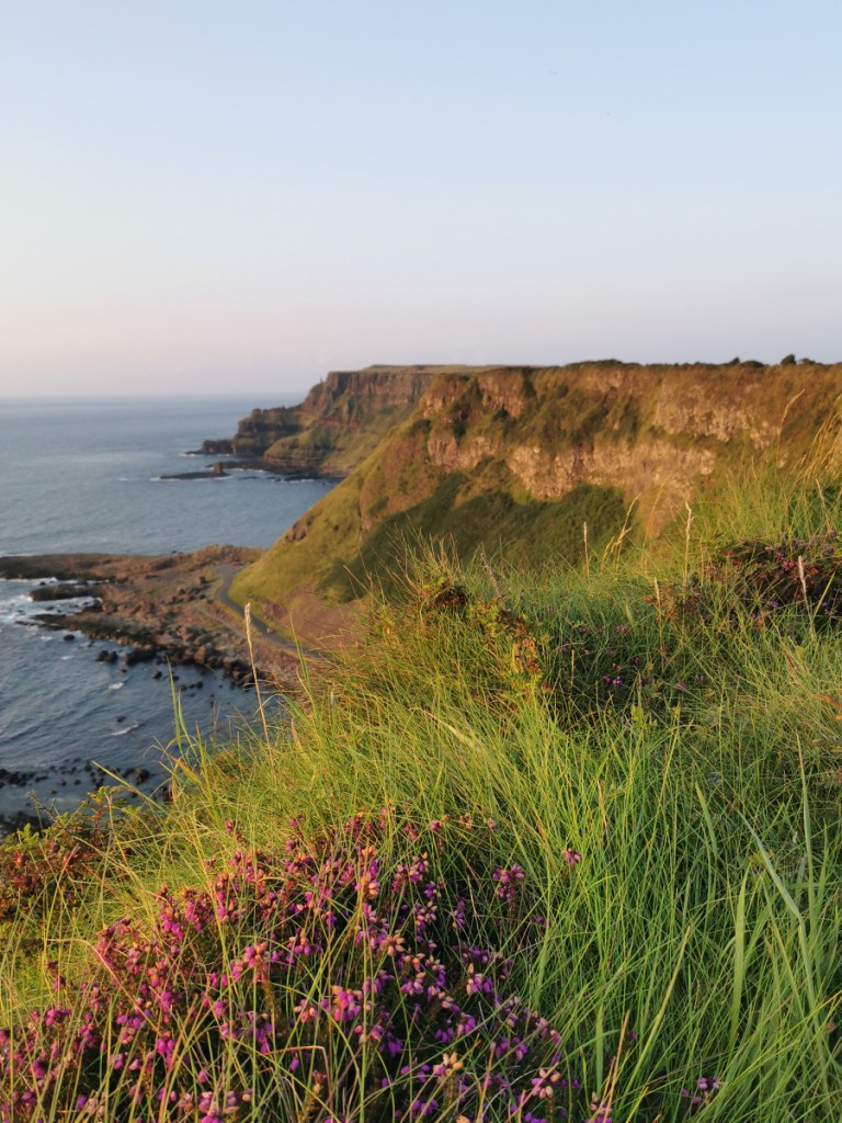 Wie auch immer, er ist sehr beeindruckend! Ab 18 Uhr kann man am Visitor’s Center umsonst parken und da wir dieses Naturschauspiel am liebsten in der Abendsonne bewundern wollten, kam uns das gerade recht. Man musste ein bisschen laufen, aber das war nun wirklich kein Problem. Die Sonne lachte, die Heide blühte und nach ca 20 Minuten waren wir schon da. 40.000 Basaltsäulen auf einem Haufen sind schon sehr beeindruckend! Man konnte über sie drüberlaufen oder sich einfach draufsetzen und dem Meer zusehen.