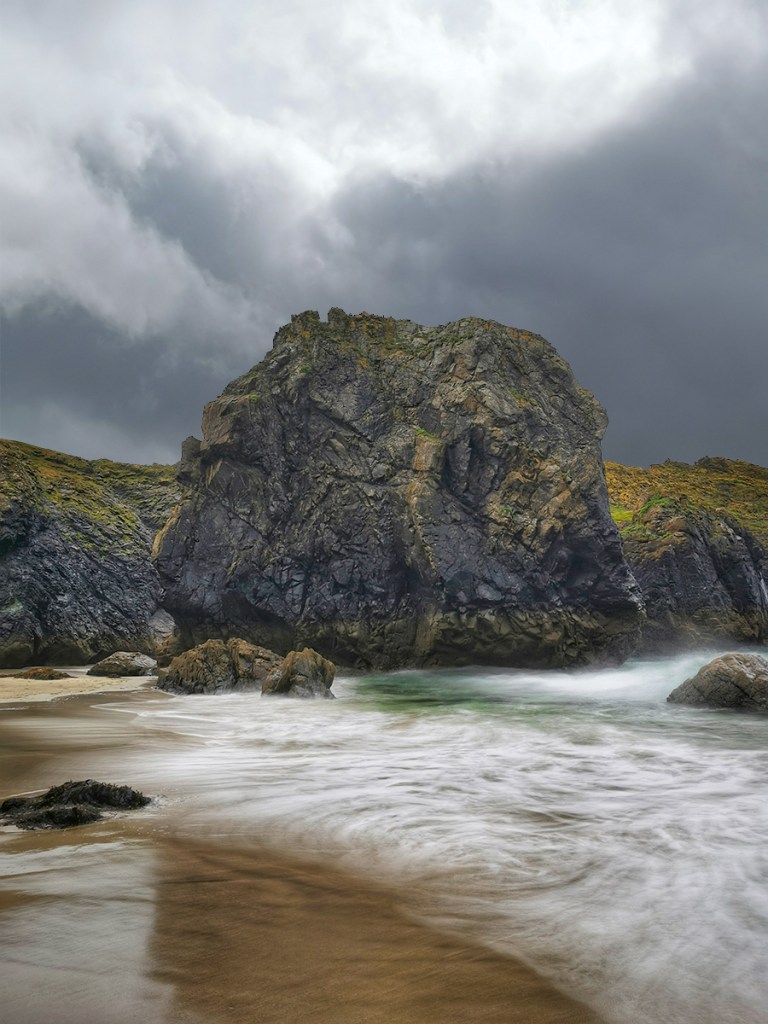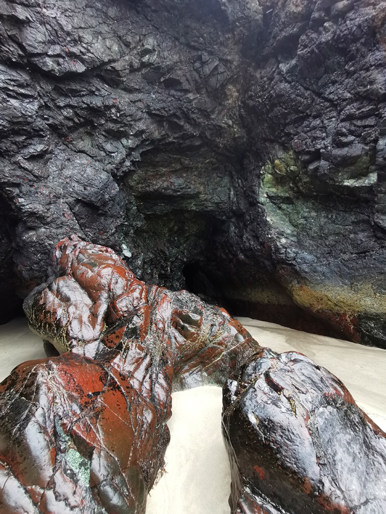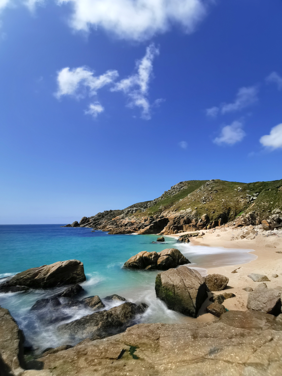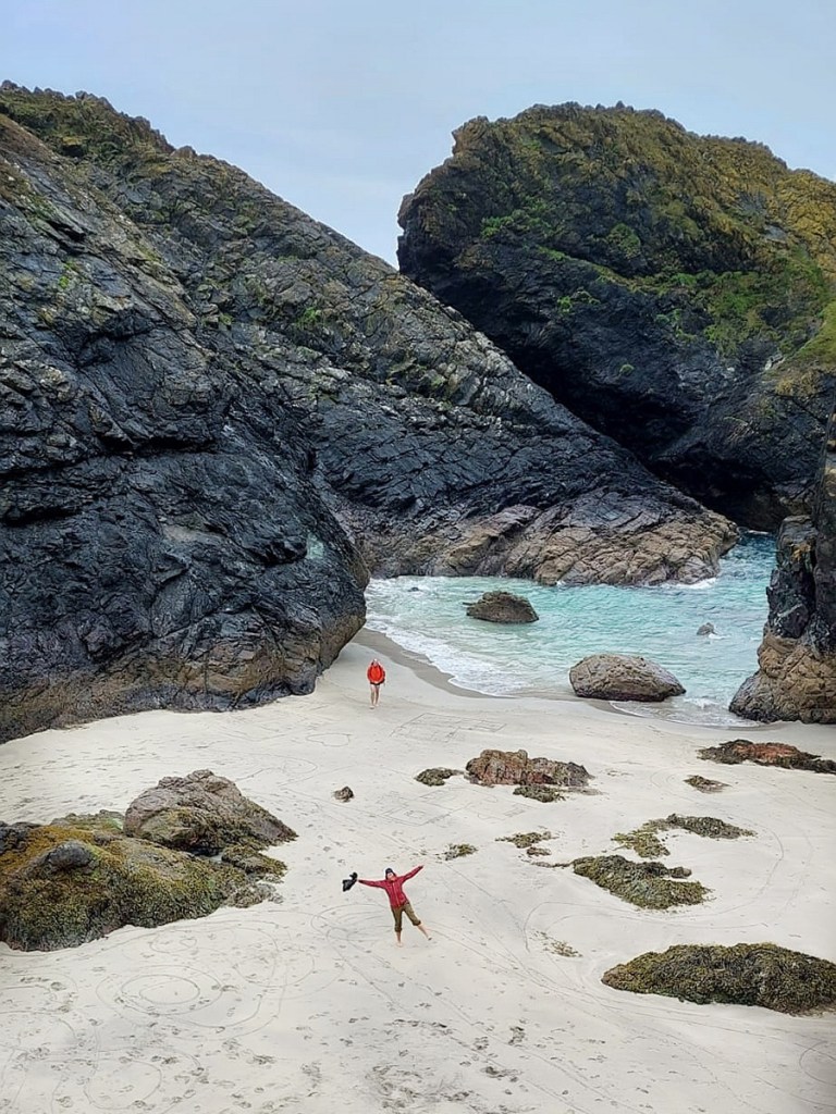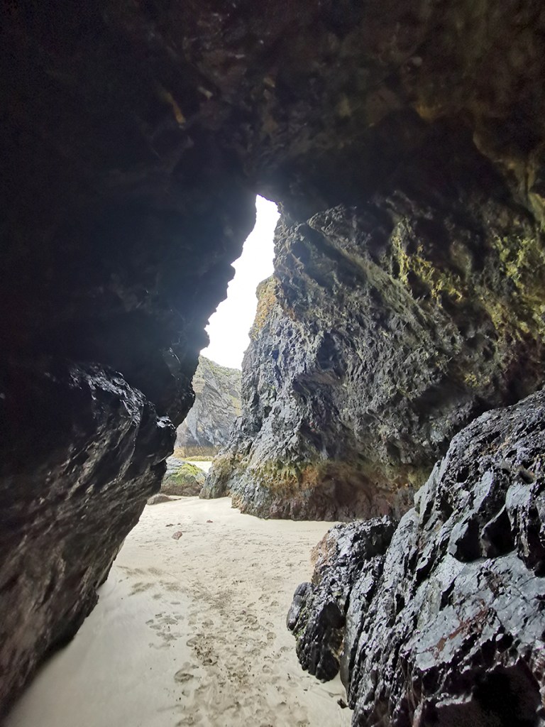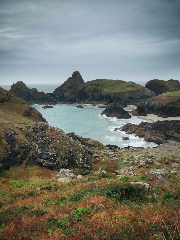 Am nächsten Tag hatten wir nicht so schönes Wetter und machten einen Ausflug zur Kynance Cove, einem der berühmtesten Strände in Cornwall, da dieser aus vielen kleinen Buchten und Höhlen besteht und sich hier bei Ebbe kleine natürliche Felsenpools bilden, in denen man baden kann. Bei Flut dahingegen ist dieser zauberhafte Strand komplett verschwunden. Bei dem regnerischen windigen Wetter waren wir alleine dort. Das hatte seinen ganz eigenen Charme.