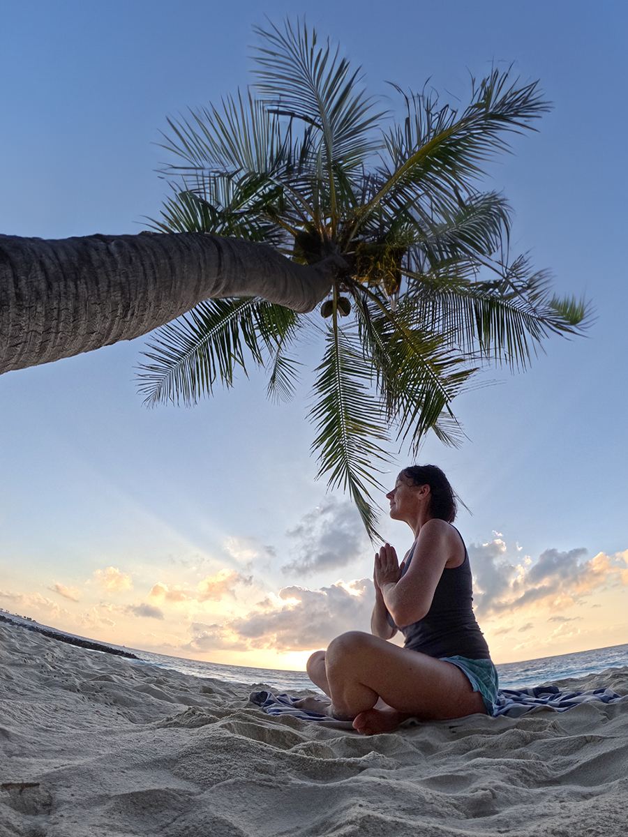 Tatsächlich hatte ich überhaupt keinen Jetlag. Da wir hier mit der Sonne aufgestanden und ein paar Stunden nach Sunset ins Bett gegangen sind, war ich ganz schnell im natürlichen Rhythmus der Insel. Morgens bei Sonnenaufgang Yoga am Strand, dann eine Runde schwimmen gehen noch vor dem Frühstück … was für ein Luxus!