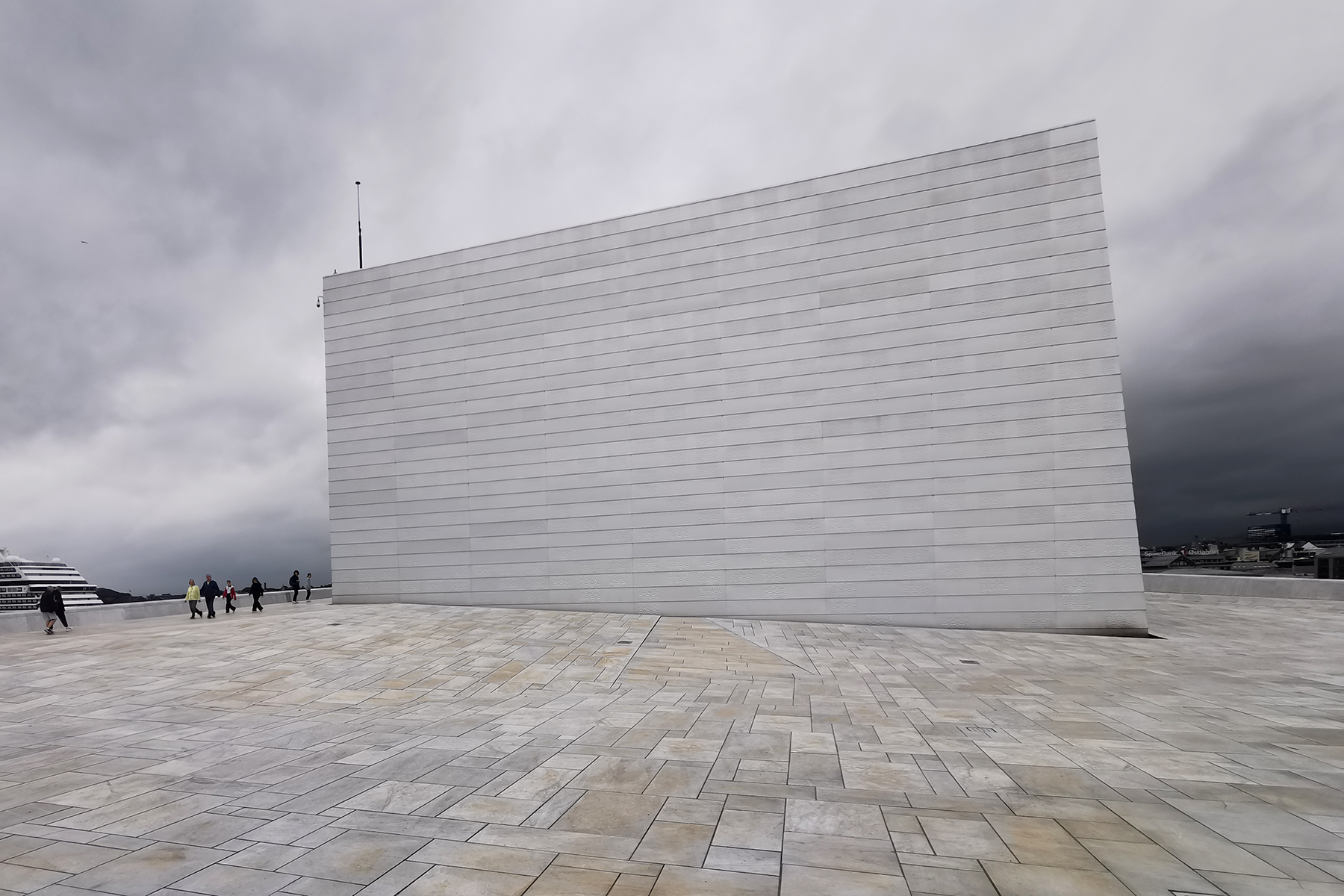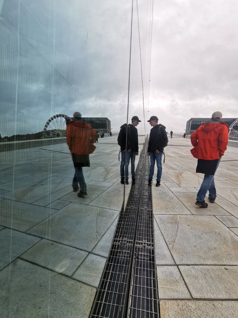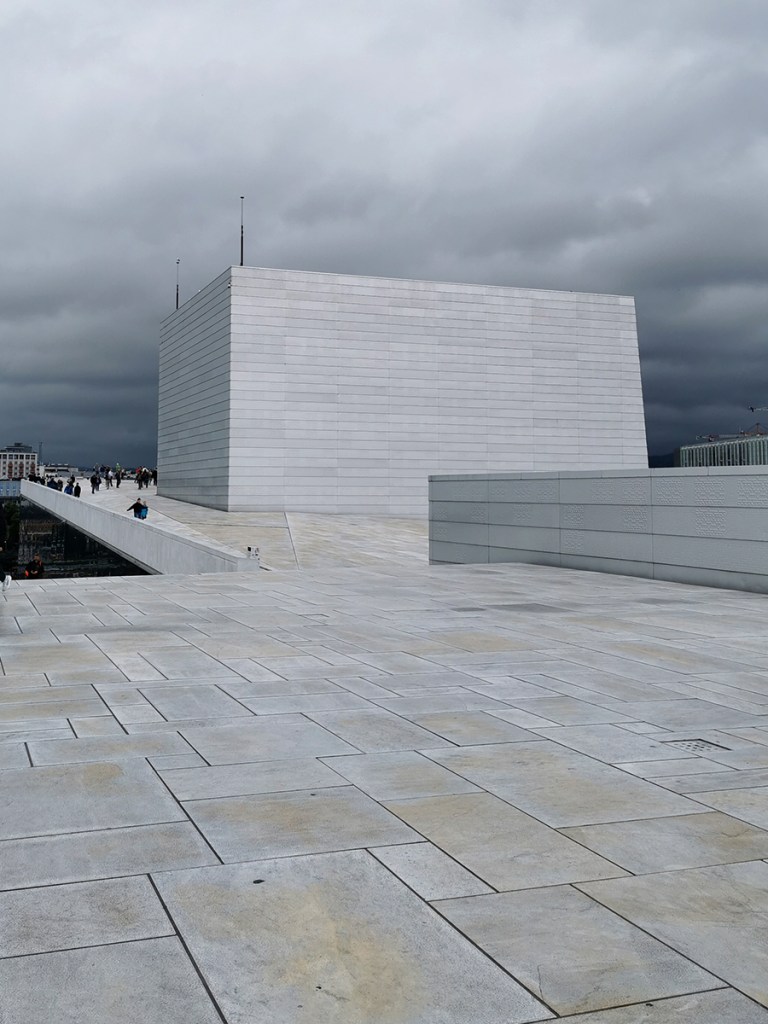 Wir mussten schon morgens unser Bobil abgeben, aber abends erst fliegen. Somit hatten wir noch die Gelegenheit auf einen kleinen Abstecher per Zug nach Oslo. Aber was soll ich sagen? Erstmal regnete es und plötzlich war alles grau. Das kannten wir hier ja gar nicht. Dann wuselten plötzlich so viele Menschen um einen herum. Auch das hatten wir die letzten Wochen überhaupt nicht erlebt. Wir steuerten das wirklich beeindruckende Opernhaus an, das sehr futuristisch aussah.