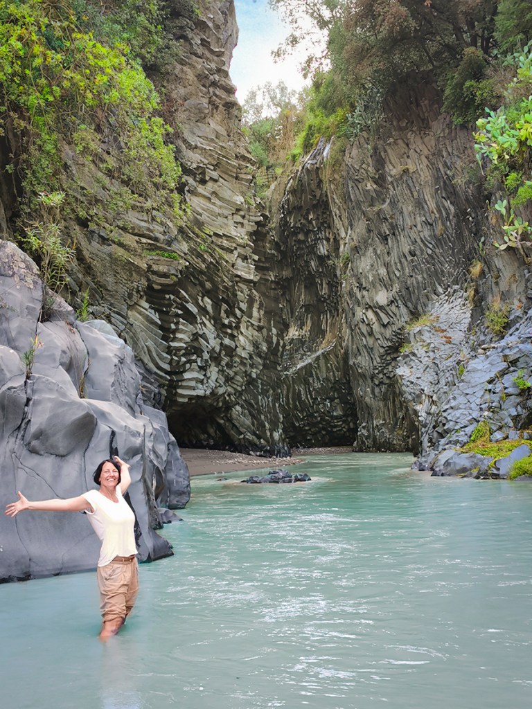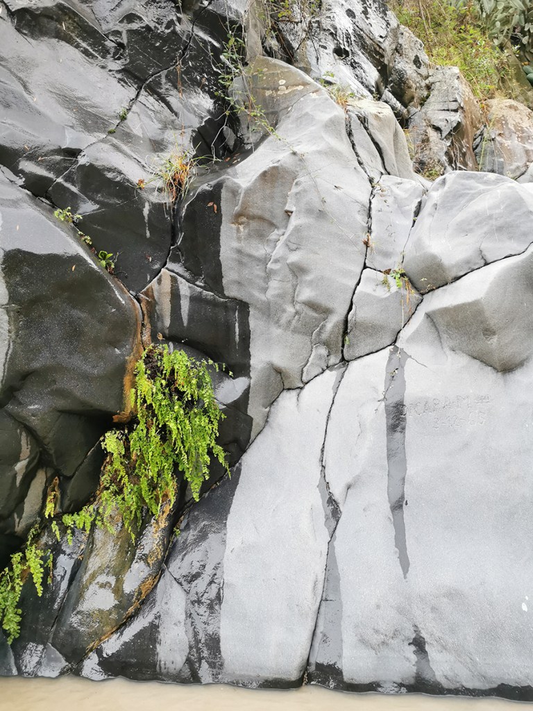 Für uns war es ein echtes Abenteuer, den tiefsten Teil der Schlucht zu besichtigen. Tage zuvor hattes es ein wahres Unwetter mit sehr viel Regen gegeben. Schon als wir die ersten Ausläufer des Alcantara erreichten, sahen wir , dass das Wasser ganz braun war von den Schlammlawinen. Zur Schlucht selbst konnte man über den üblichen Weg dann gar nicht laufen. Dieser war gesperrt und die Schlucht war geschlossen.