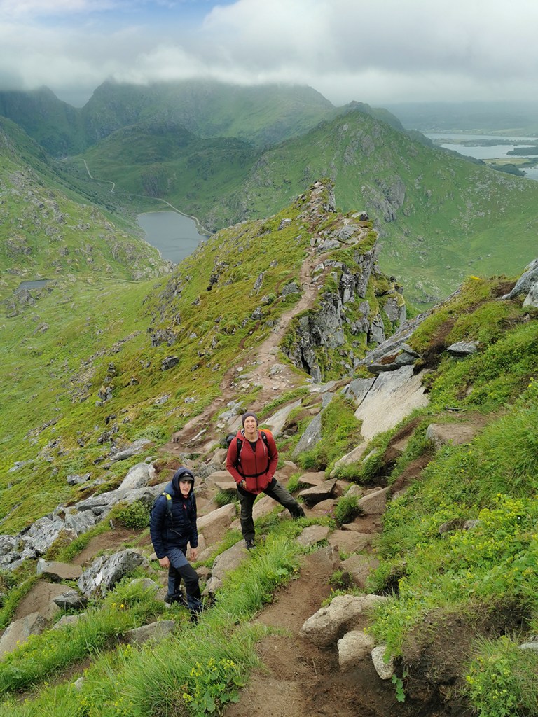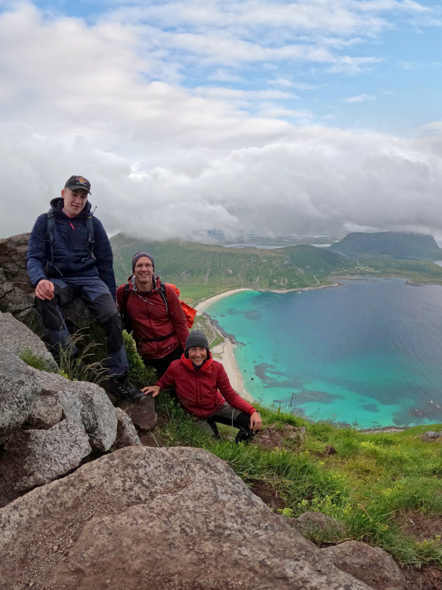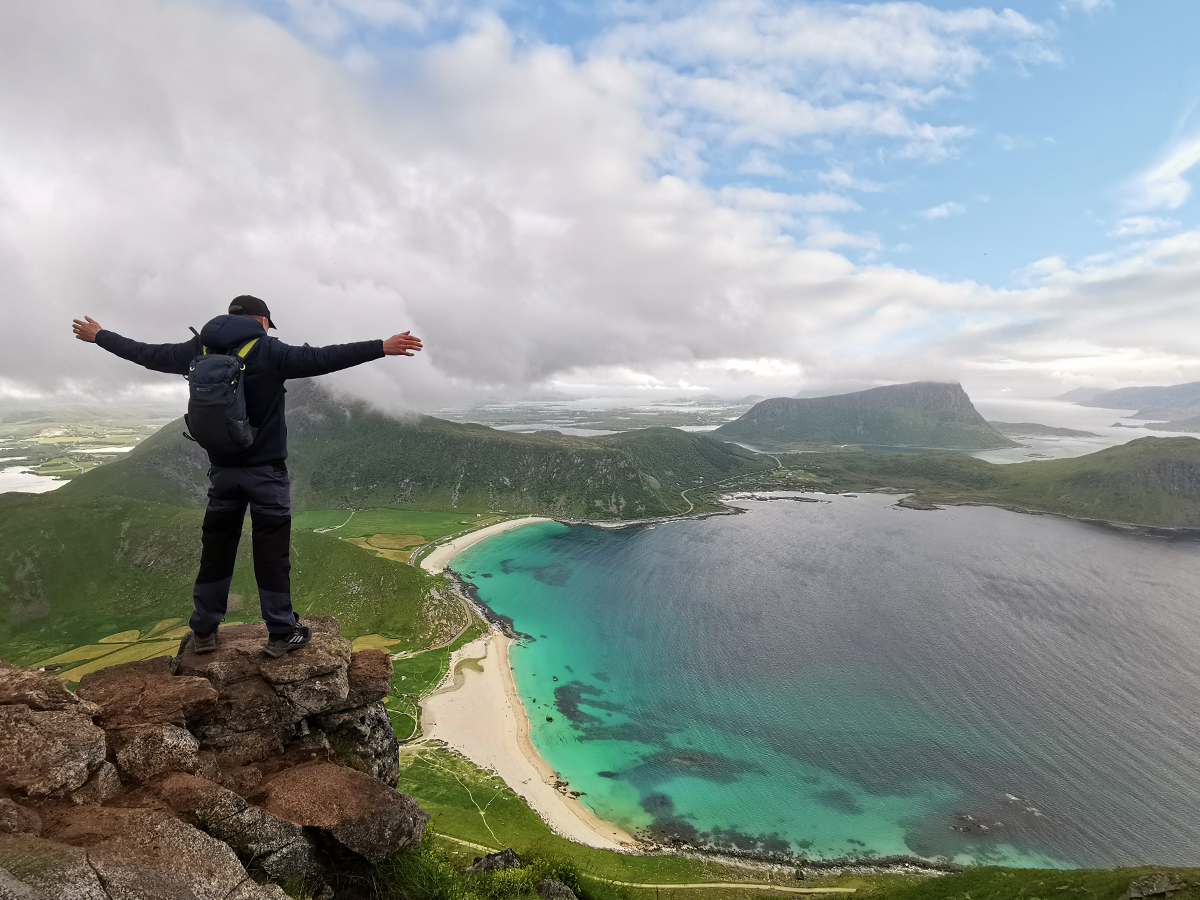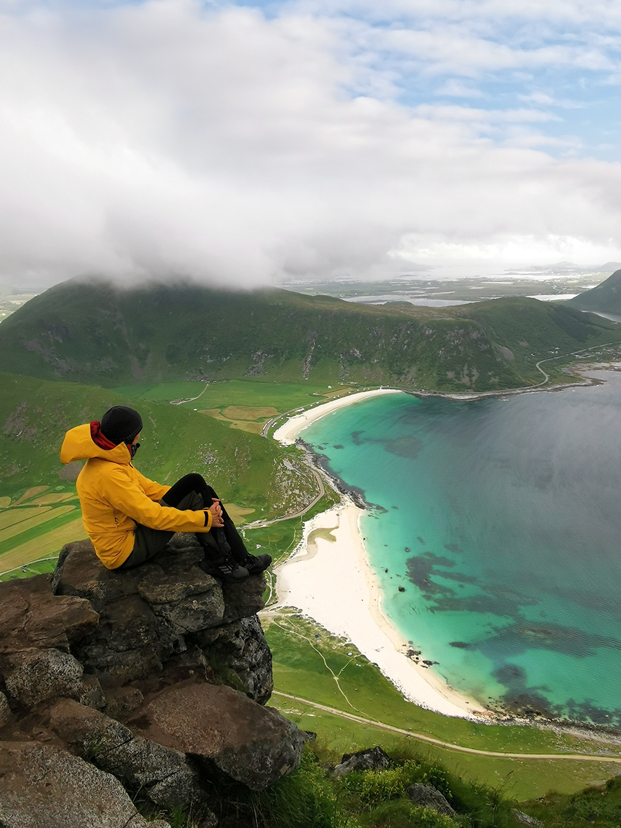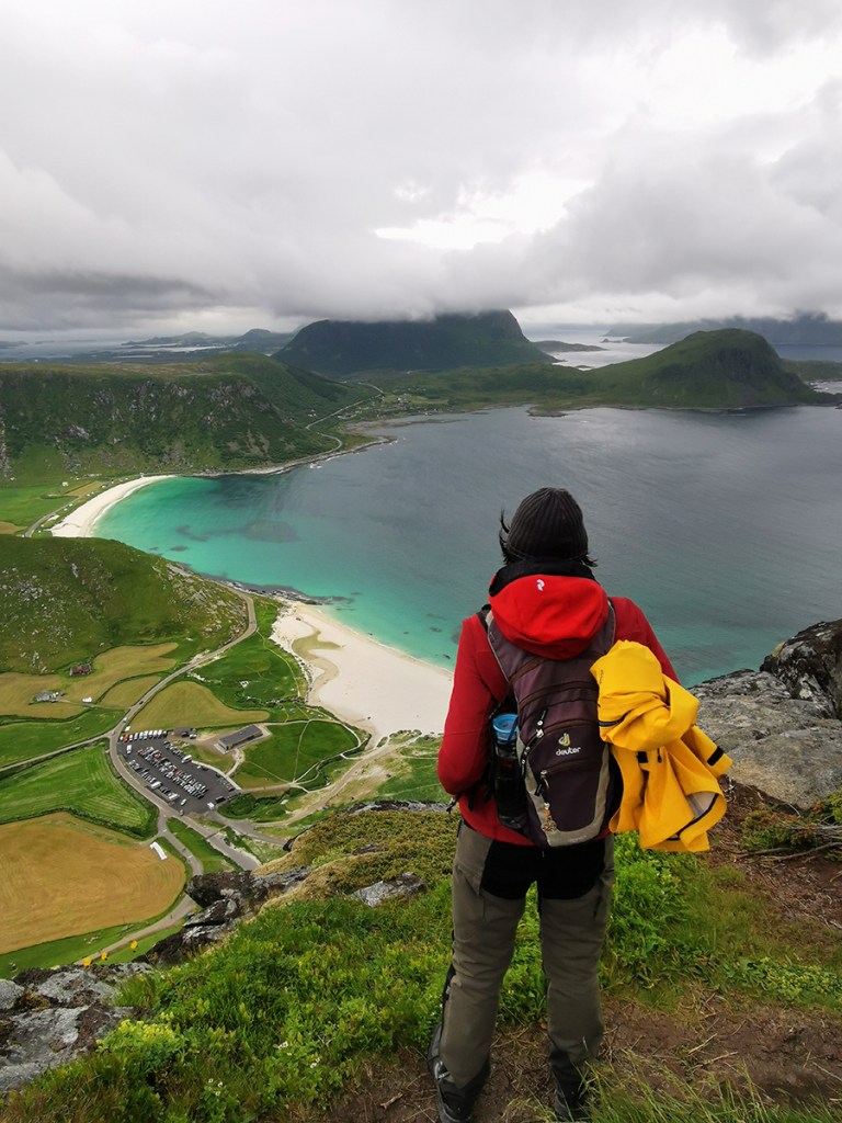 Das Schöne am Mannen mit seinen 400 Höhenmetern ist, dass man immer wieder Ausblick auf die umliegenden Strände und Berge hat. Besonders der Blick auf den türkis-weißen Hauklandstranda ist atemberaubend. Auch wenn die Sonne sich nur ab und zu blicken ließ und ein scharfer Wind wehte, hatte man durch die schönen Farben irgendwie immer das Gefühl, dass die Sonne schien.