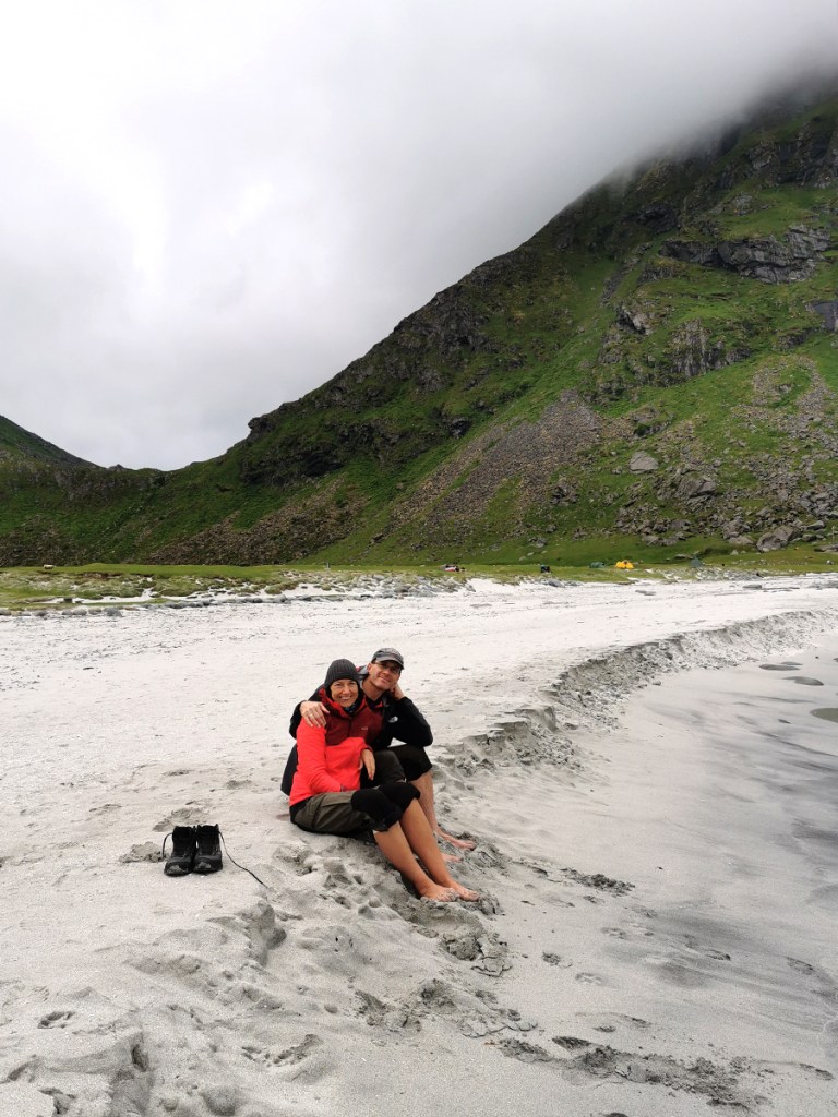 Nachdem wir ja vor 4 Jahren schon einmal versucht hatten, den Mannen bei Schnee zu erklimmen und dann aber abbrechen mussten, weil es einfach viel zu glatt war, unternahmen wir nun einen 2. Versuch. Wir parkten am wunderschönen Hauklandstranda, auf dem deutlich mehr los war als im Herbst vor 4 Jahren und dann ging es bergauf.