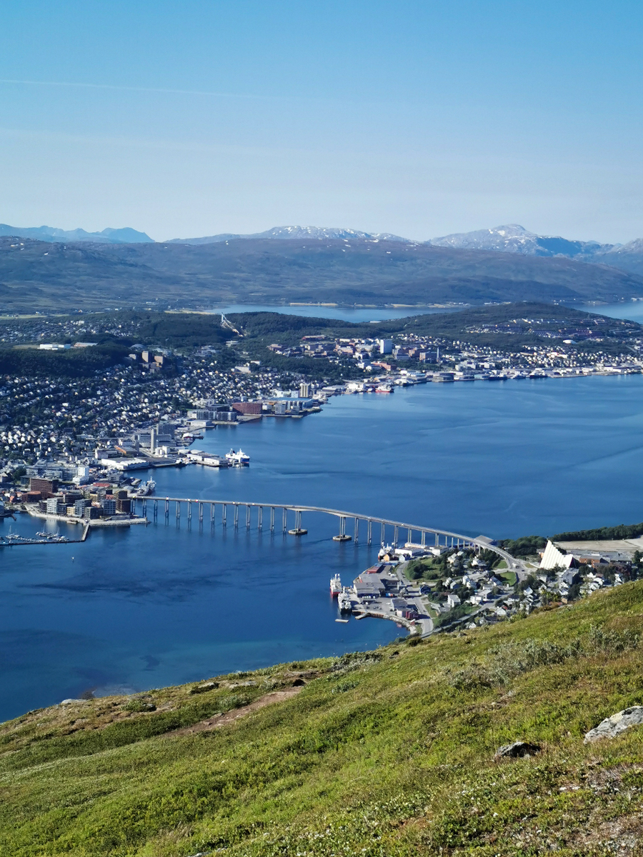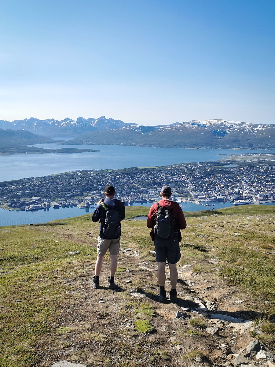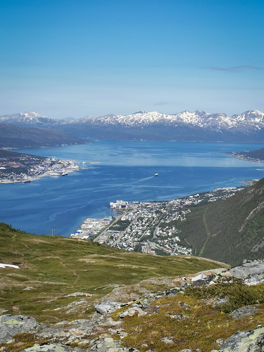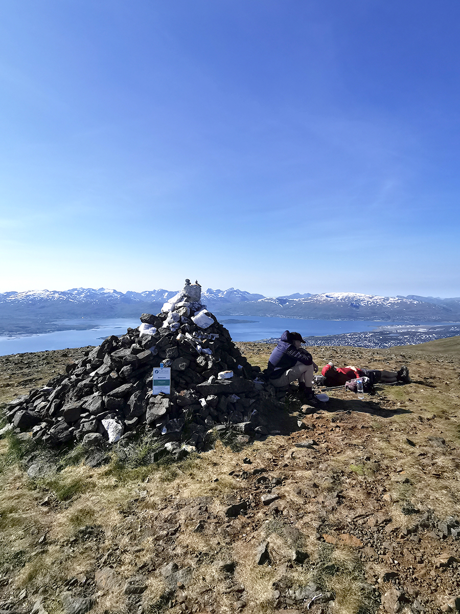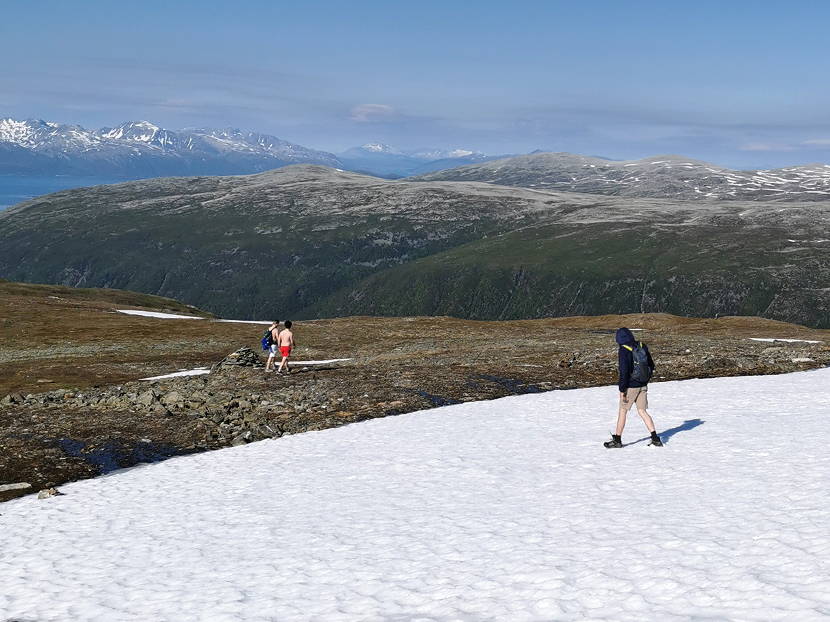 Schon nach ungefähr einem Kilometer kam das erste kleine Schneefeld. Auch die Pflanzenwelt wurde alpiner und wir trafen auf Schnee-Enzian und Trollblumen. Und immer wieder hatte man eine wunderbare Aussicht auf Tromsø, die umliegenden schneebedeckten Berge und die blauen Fjorde.