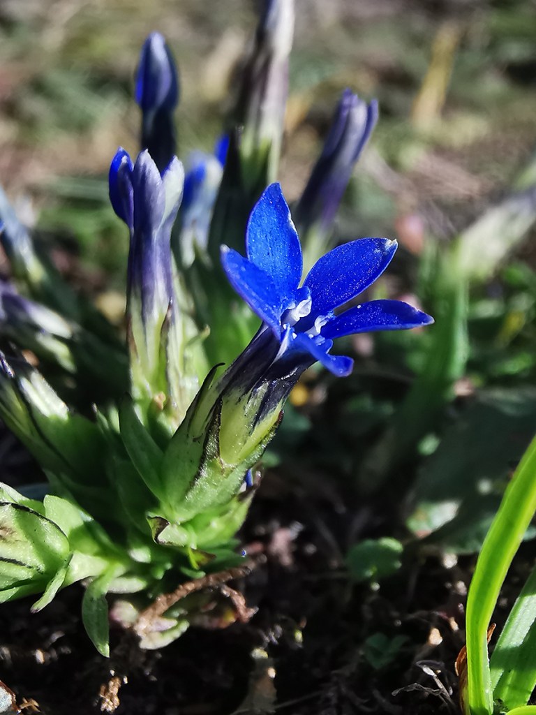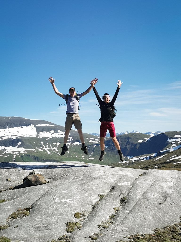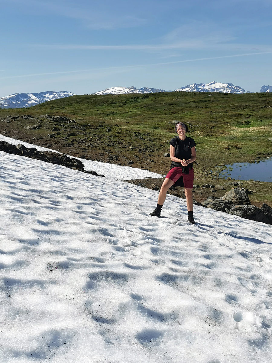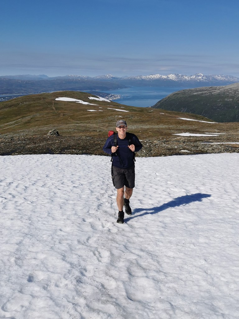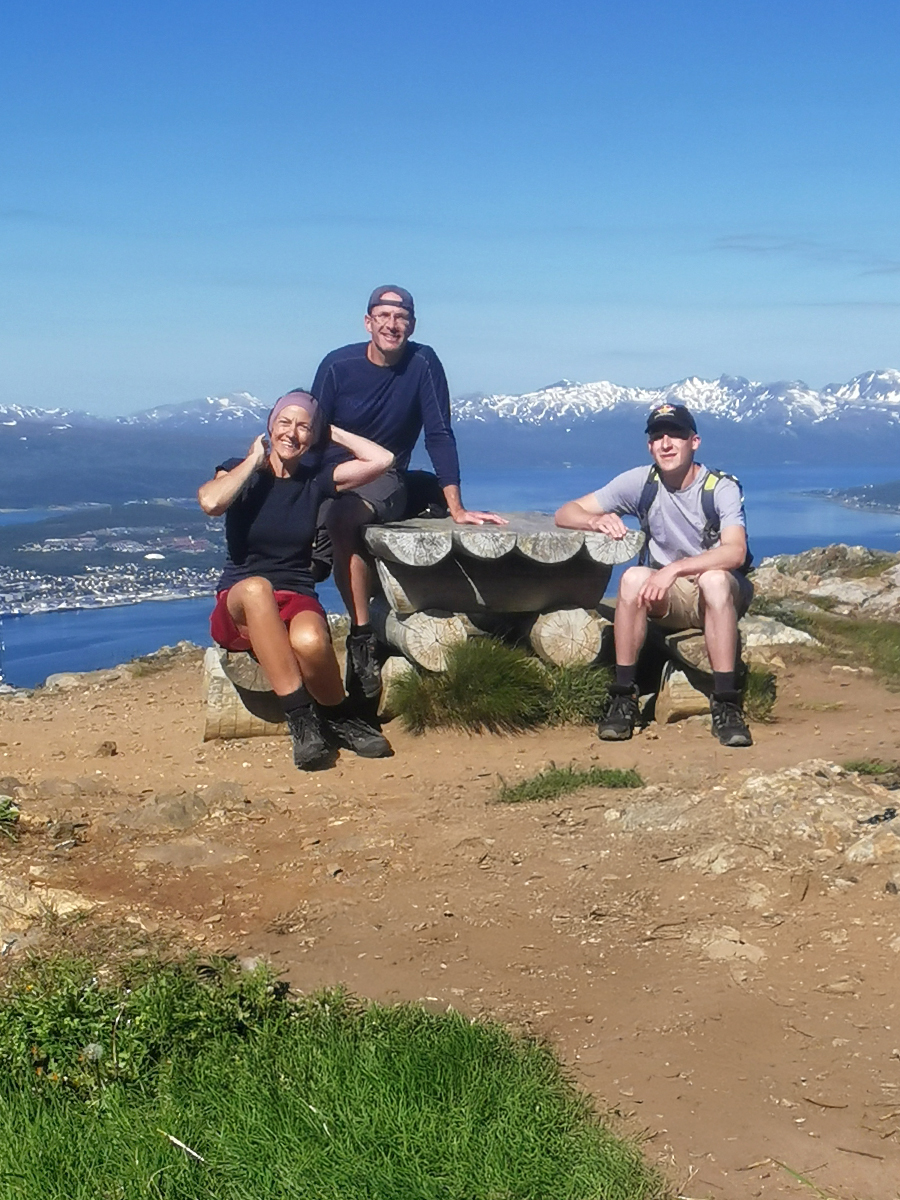 Schon nach ungefähr einem Kilometer kam das erste kleine Schneefeld. Auch die Pflanzenwelt wurde alpiner und wir trafen auf Schnee-Enzian und Trollblumen. Und immer wieder hatte man eine wunderbare Aussicht auf Tromsø, die umliegenden schneebedeckten Berge und die blauen Fjorde.